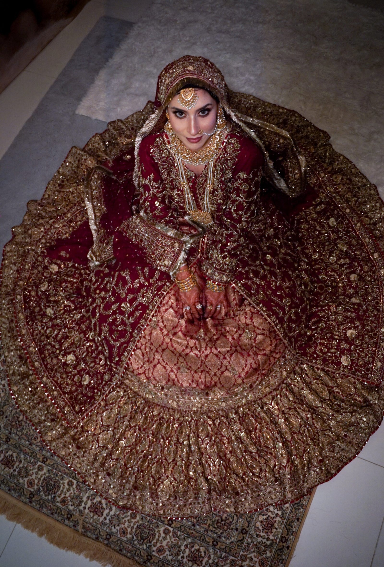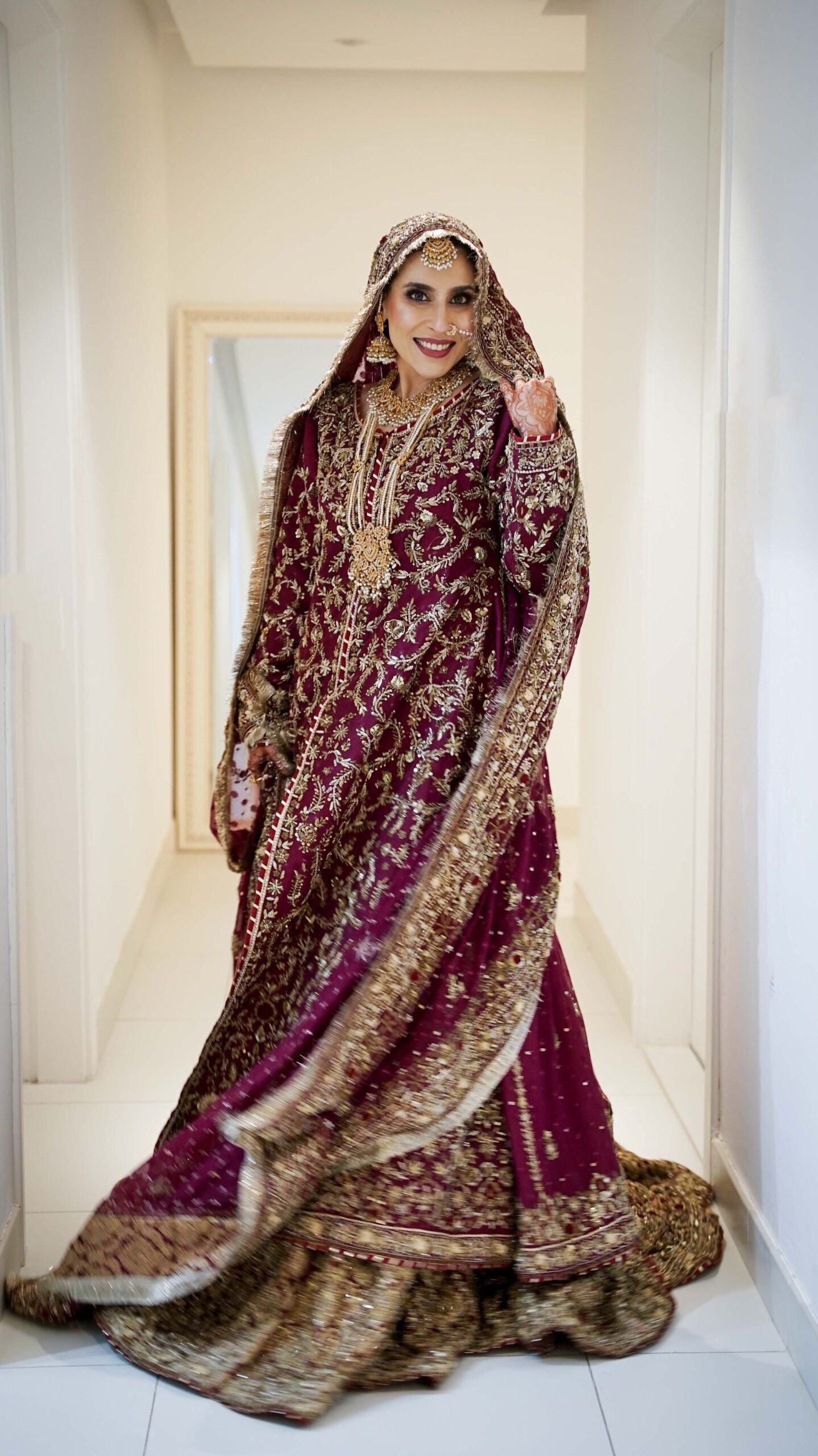 Arabic bridal dress Saher radiates the allure of timeless romance as a breathtaking ensemble in a deep magenta-pink hue, designed to embody royal elegance and artisanal finesse. The long A-line shirt is meticulously adorned with antique gold zardozi, dabka, sequins, and contrast resham French knots, creating a mesmerizing canvas of intricate craftsmanship and luxurious detail.