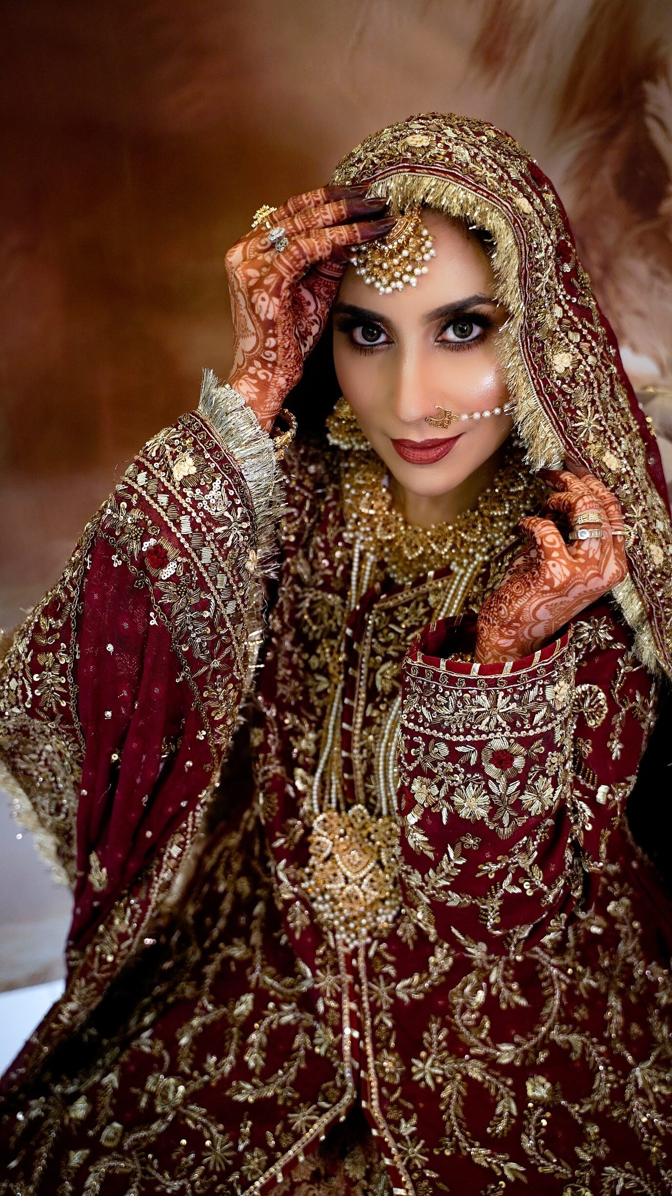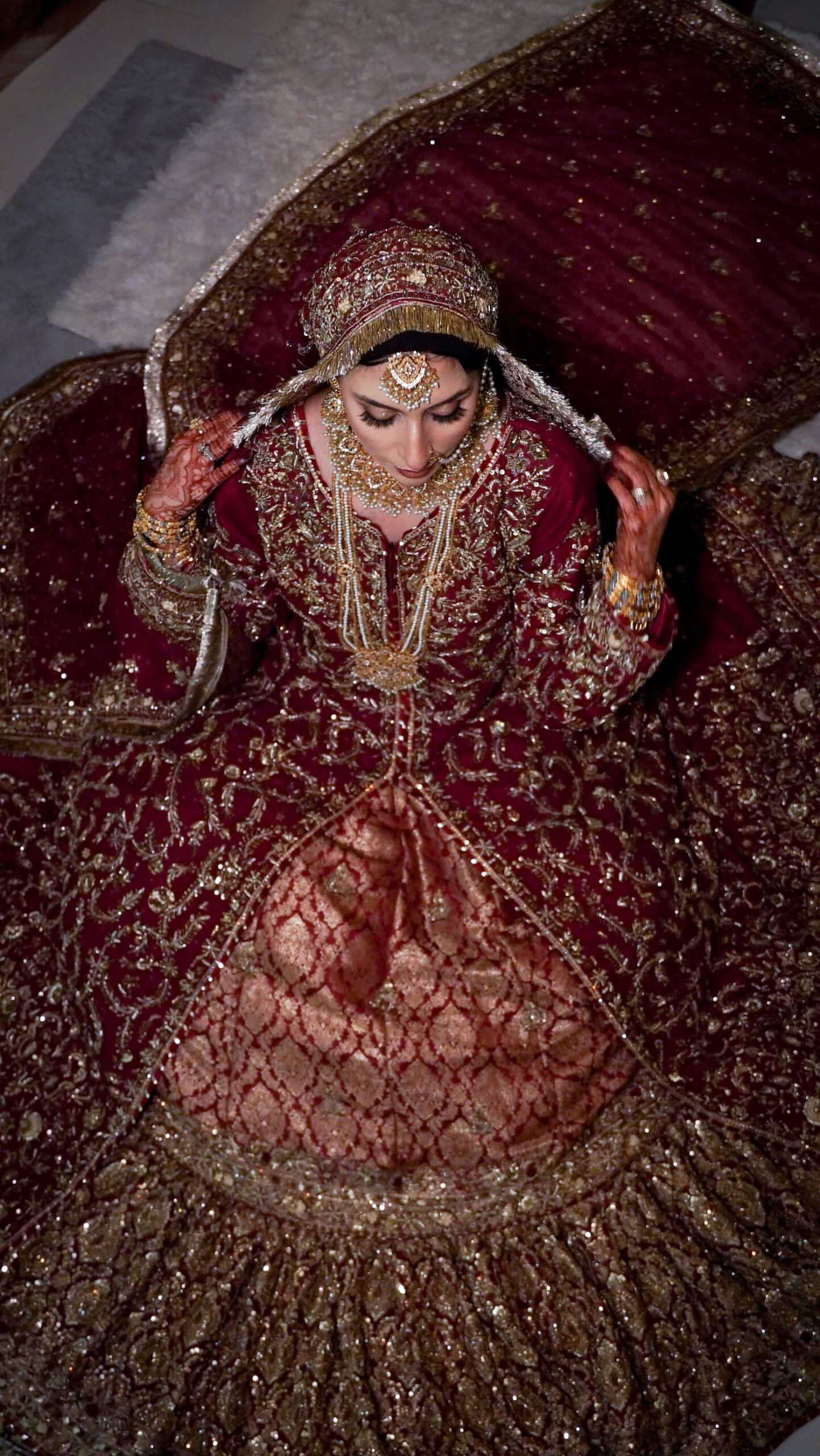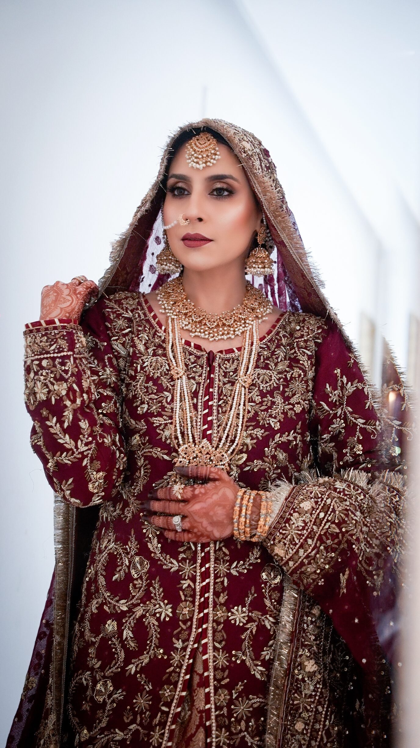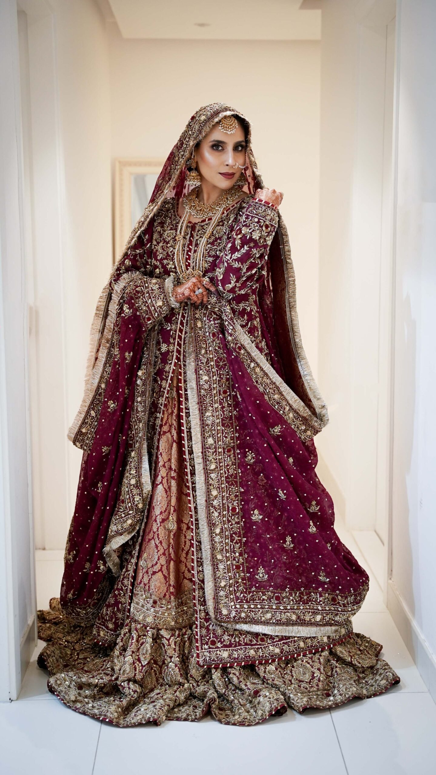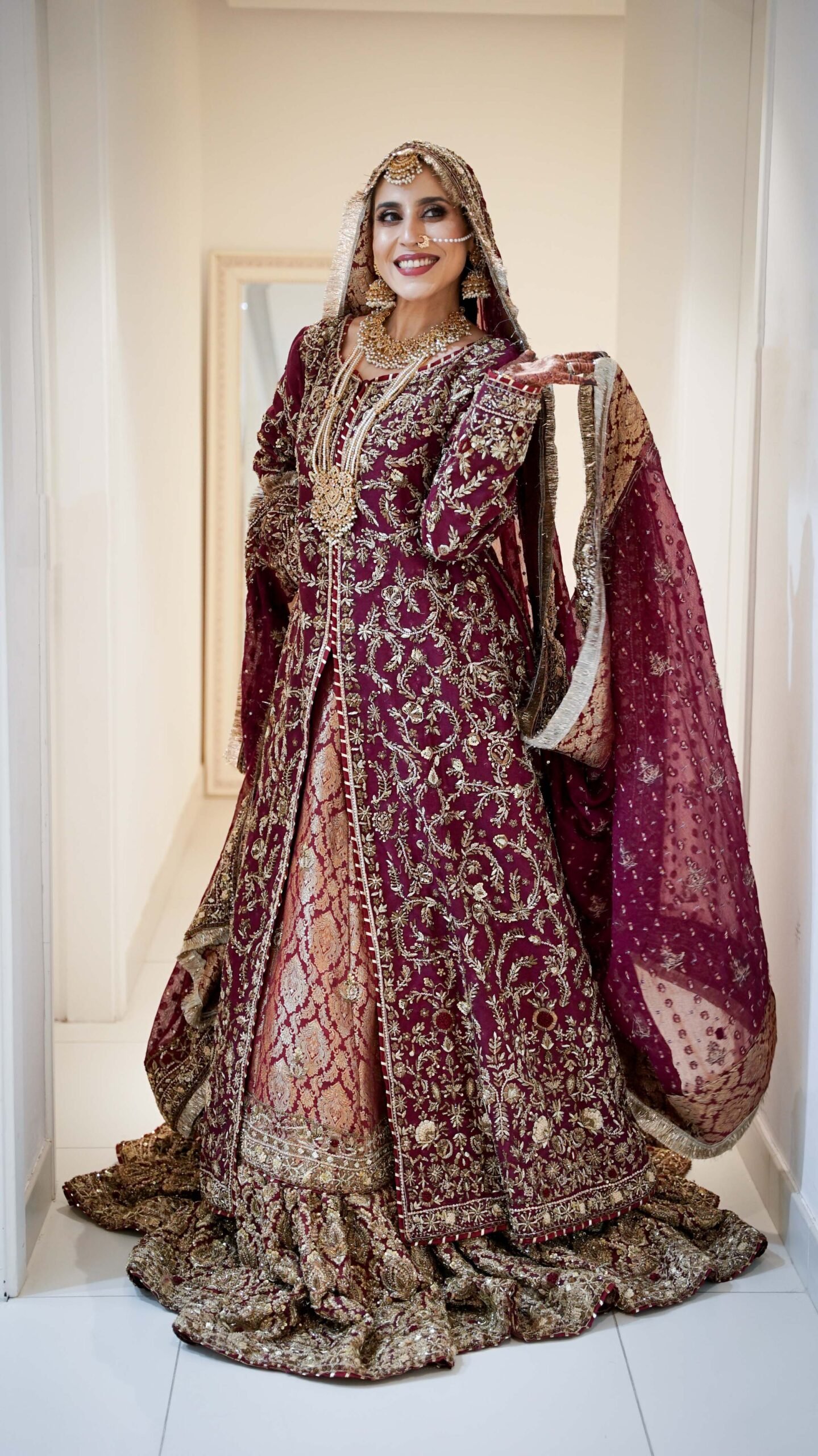 The front is heavily embellished with ornate artistry and a richly worked neckline, while the back features elegant chadi-style linear work, offering graceful continuity throughout the silhouette. A grand daman border frames the design in opulent balance, enhancing the overall regal appeal. Paired with a majestic farshi lehenga with an elegant tail, lavishly embellished to perfection, this arabic bridal dress completes its royal statement with a handworked dupatta featuring four-sided borders and delicate kiran edging — a true reflection of heritage luxury and refined bridal artistry.