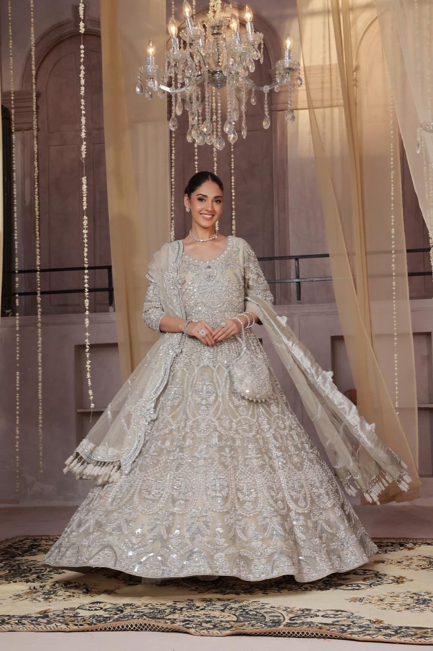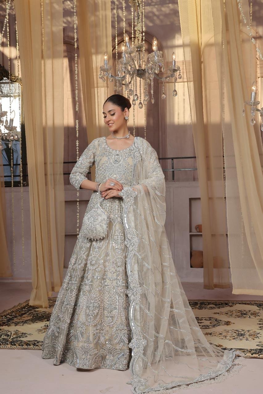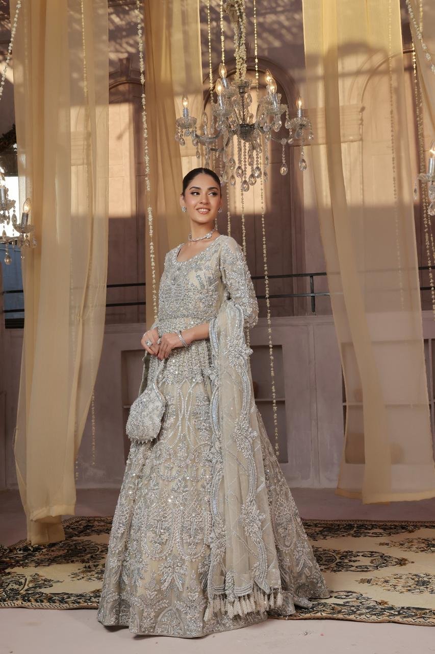 Step into elegance with Pastel Grace, a dreamy floor-length gown perfect for Valima celebrations. Crafted in soft pastel hues, this gown is adorned with intricate dabka, crystals, Swarovski accents, and jewellery-inspired detailing, enhanced with delicate handmade hanging tassels for a touch of whimsy. A flawless blend of luxury, charm, and sophistication, designed to make your special day unforgettable.