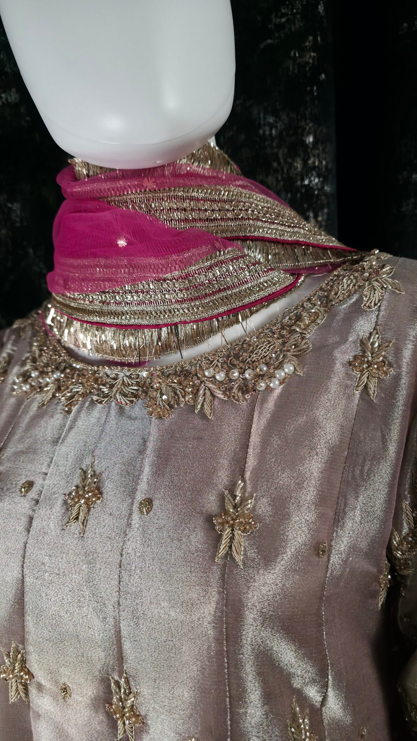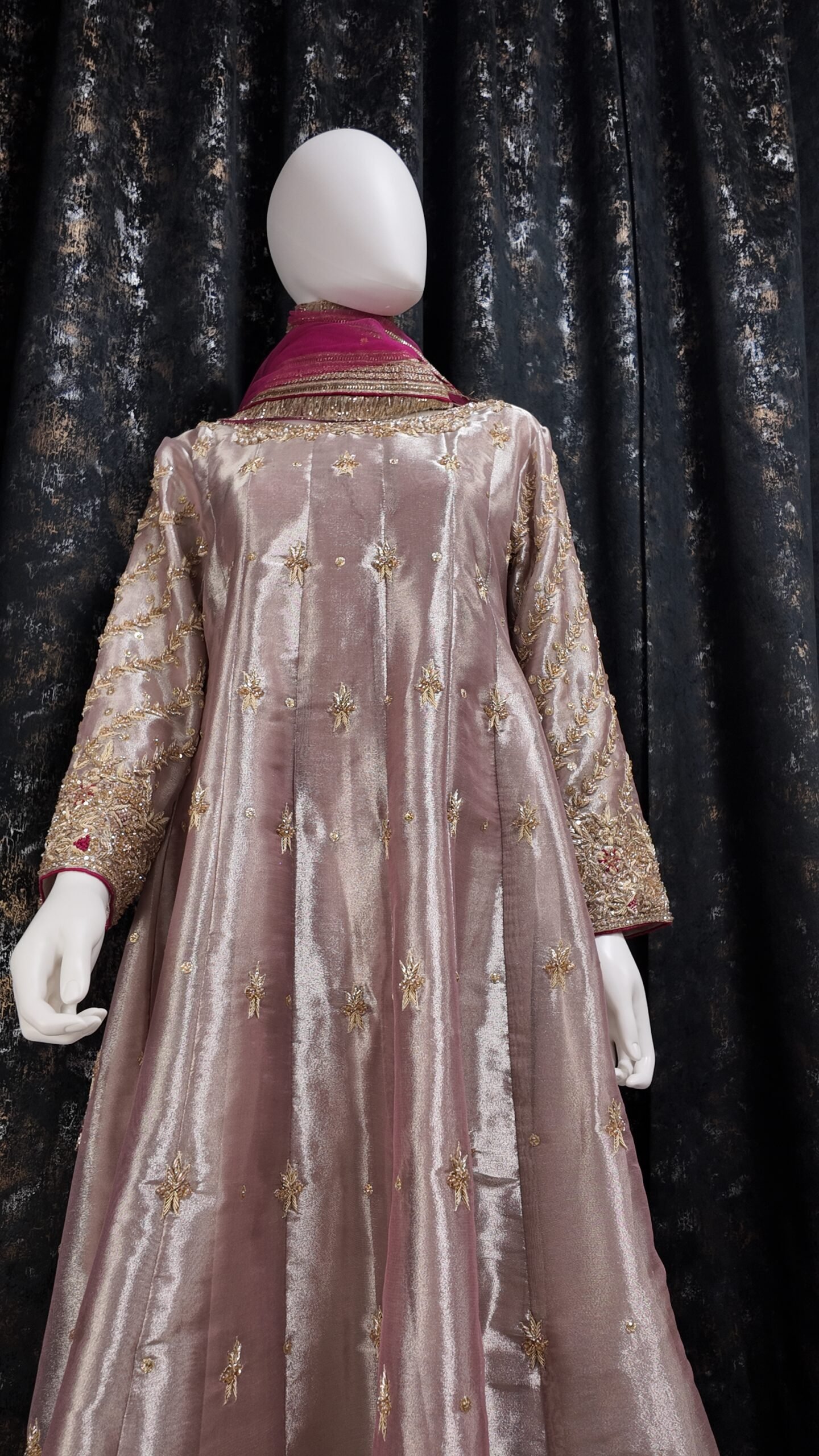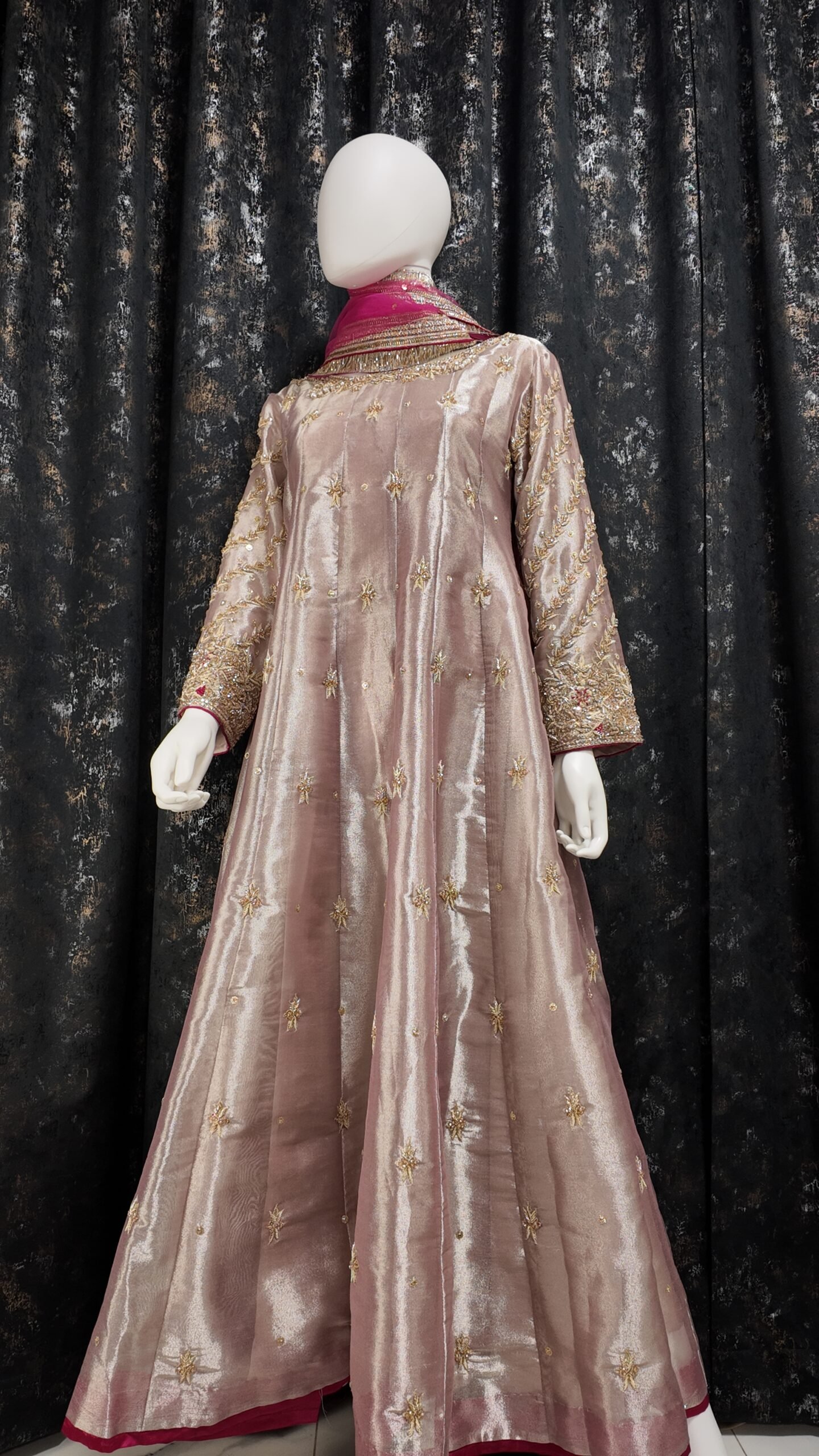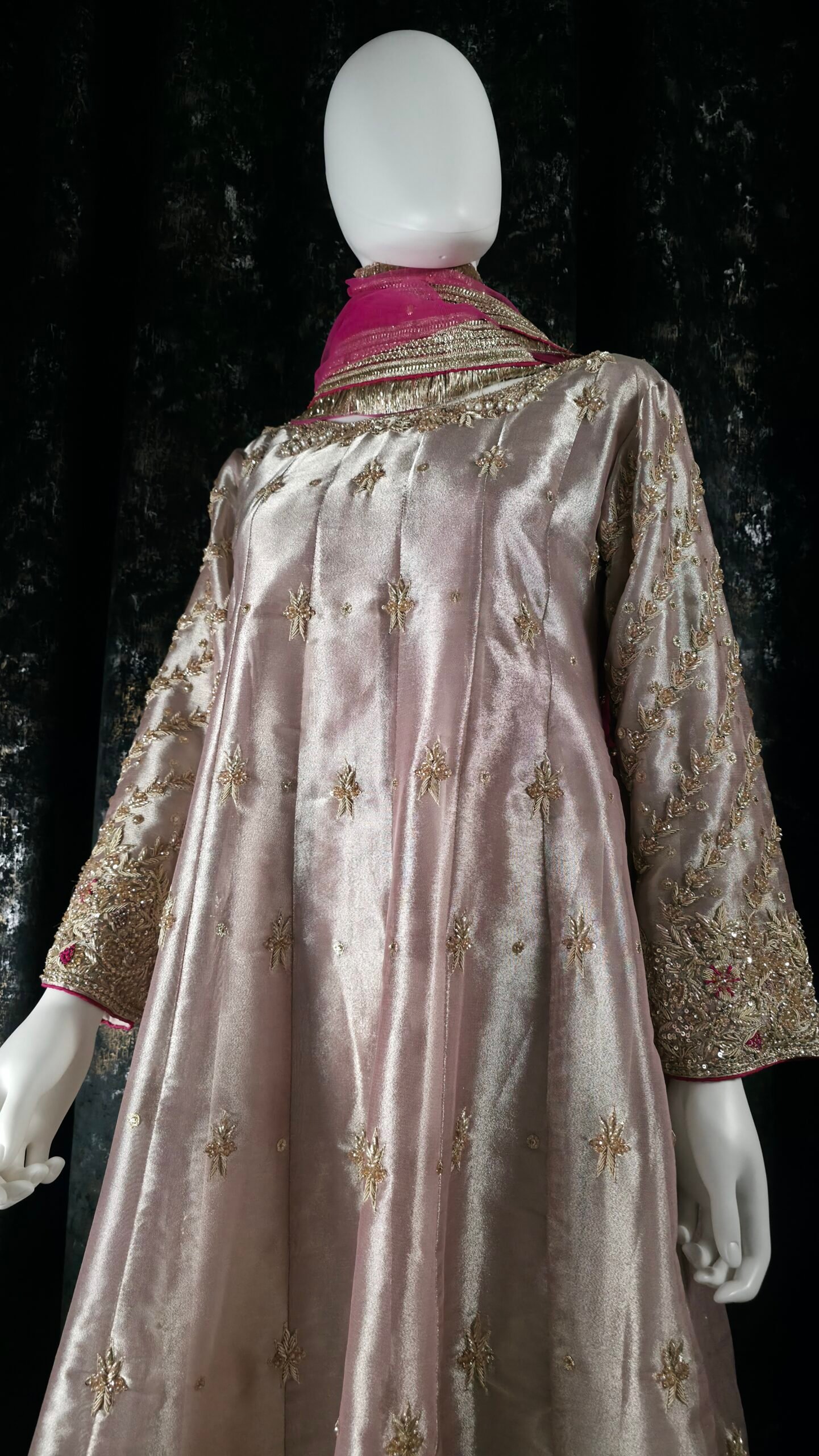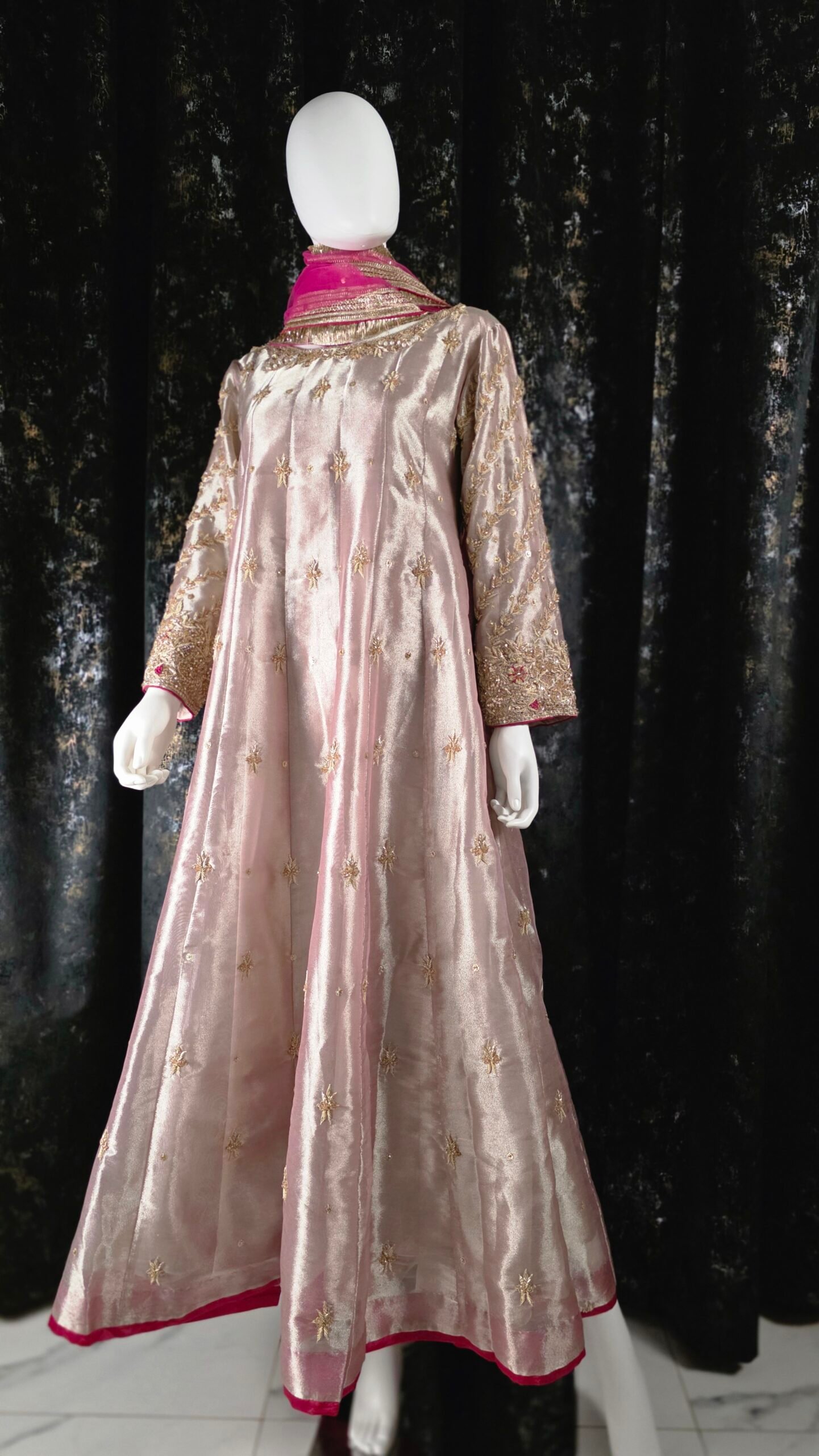 Elan is an ethereal vision in soft pastel PINK, Élan is crafted from glistening lame tissue and adorned with handworked dabka, resham, and zardozi detailing. The gown’s elongated silhouette features heavily embellished necklines—front and back— that glimmer with artistry. The sleeves, worked in diagonal chari pattern, exude intricate beauty, while center motifs lend balance and sophistication. This ensemble is the epitome of luxury and grace, perfect for a statement formal look.