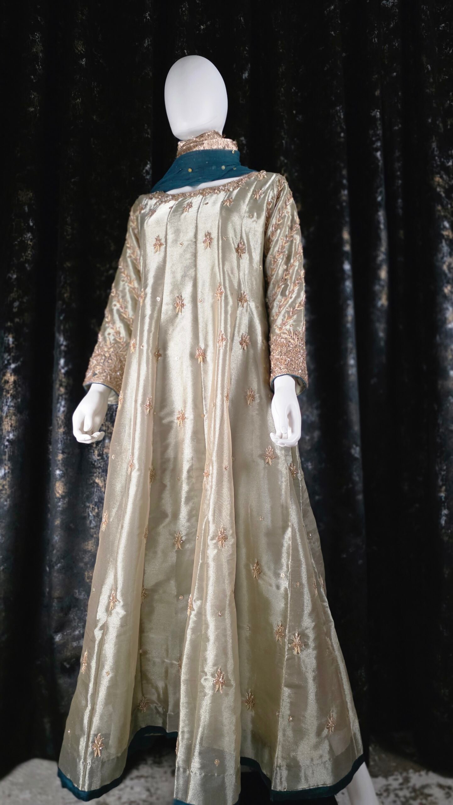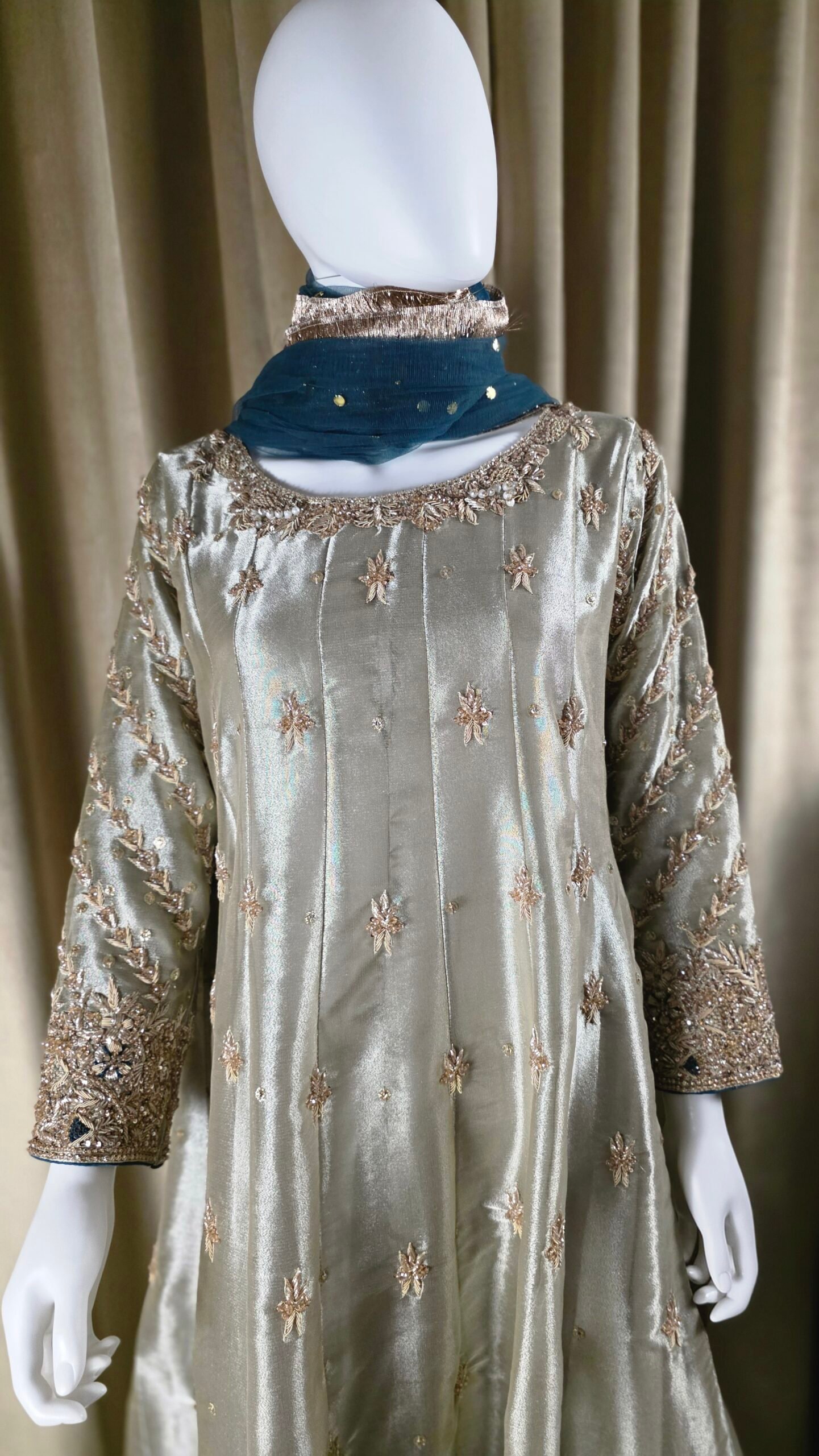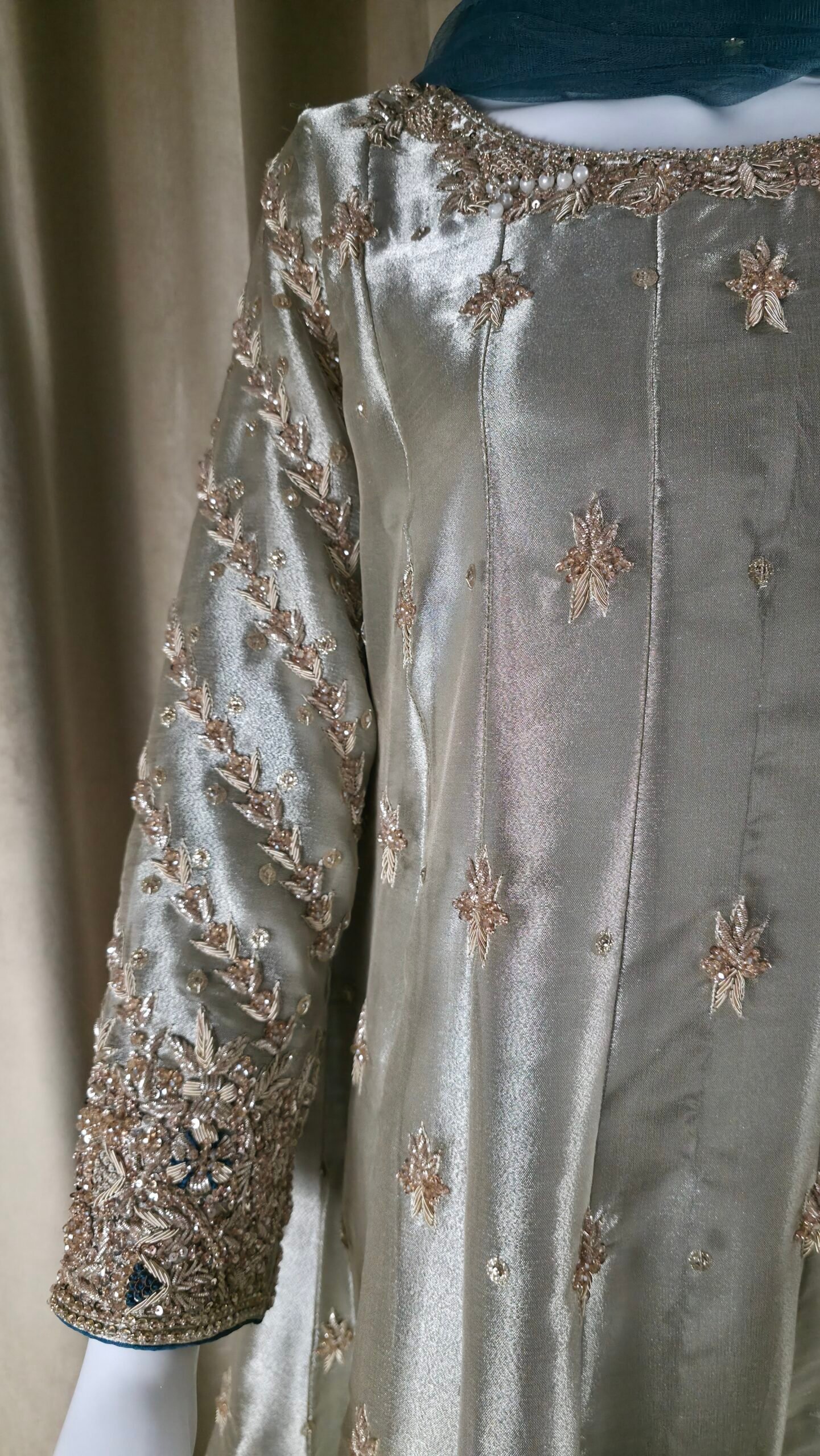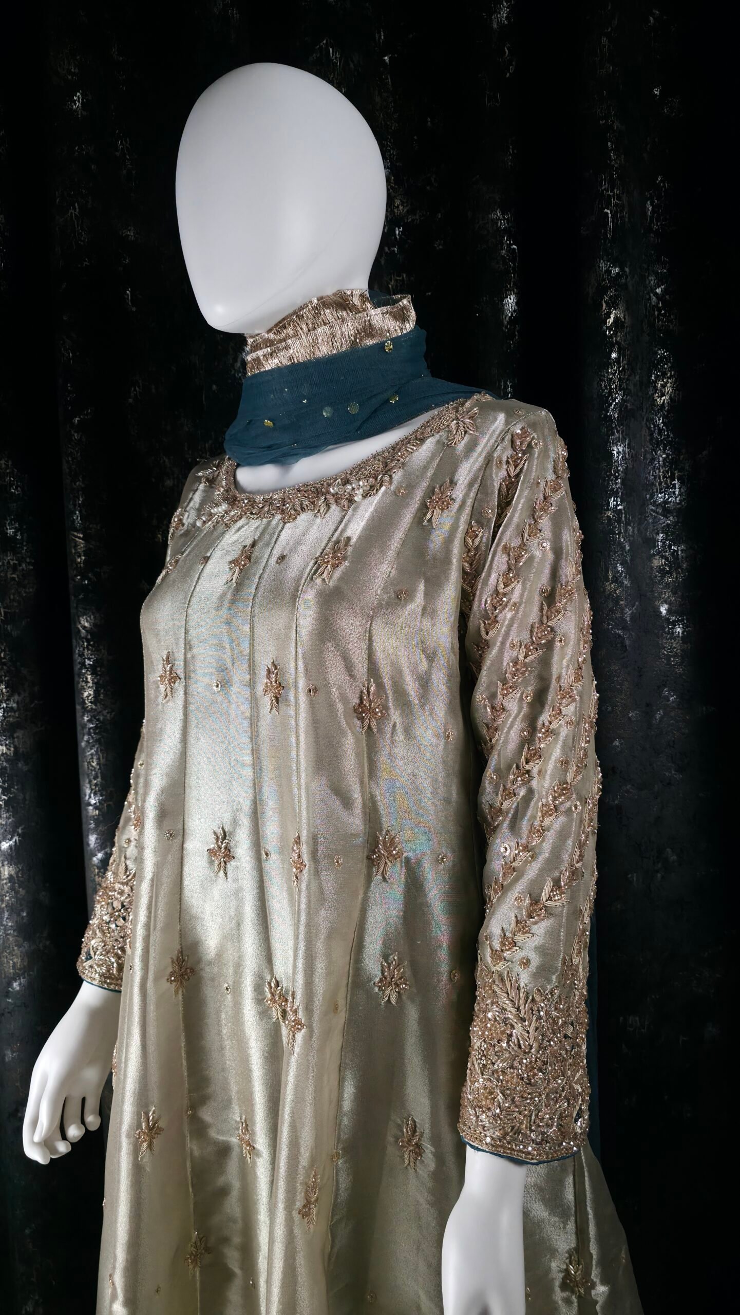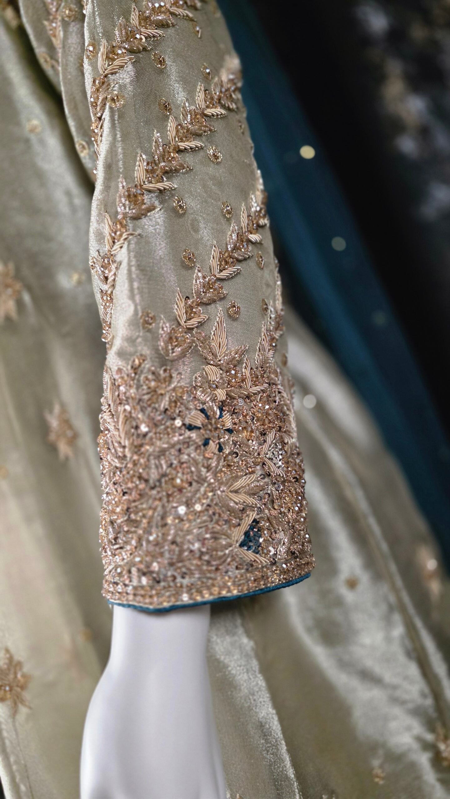 Elan is an ethereal vision in soft pastel green, Élan is crafted from glistening lame tissue and adorned with handworked dabka, resham, and zardozi detailing. The gown’s elongated silhouette features heavily embellished necklines—front and back— that glimmer with artistry. The sleeves, worked in diagonal chari pattern, exude intricate beauty, while center motifs lend balance and sophistication. This ensemble is the epitome of luxury and grace, perfect for a statement formal look.
