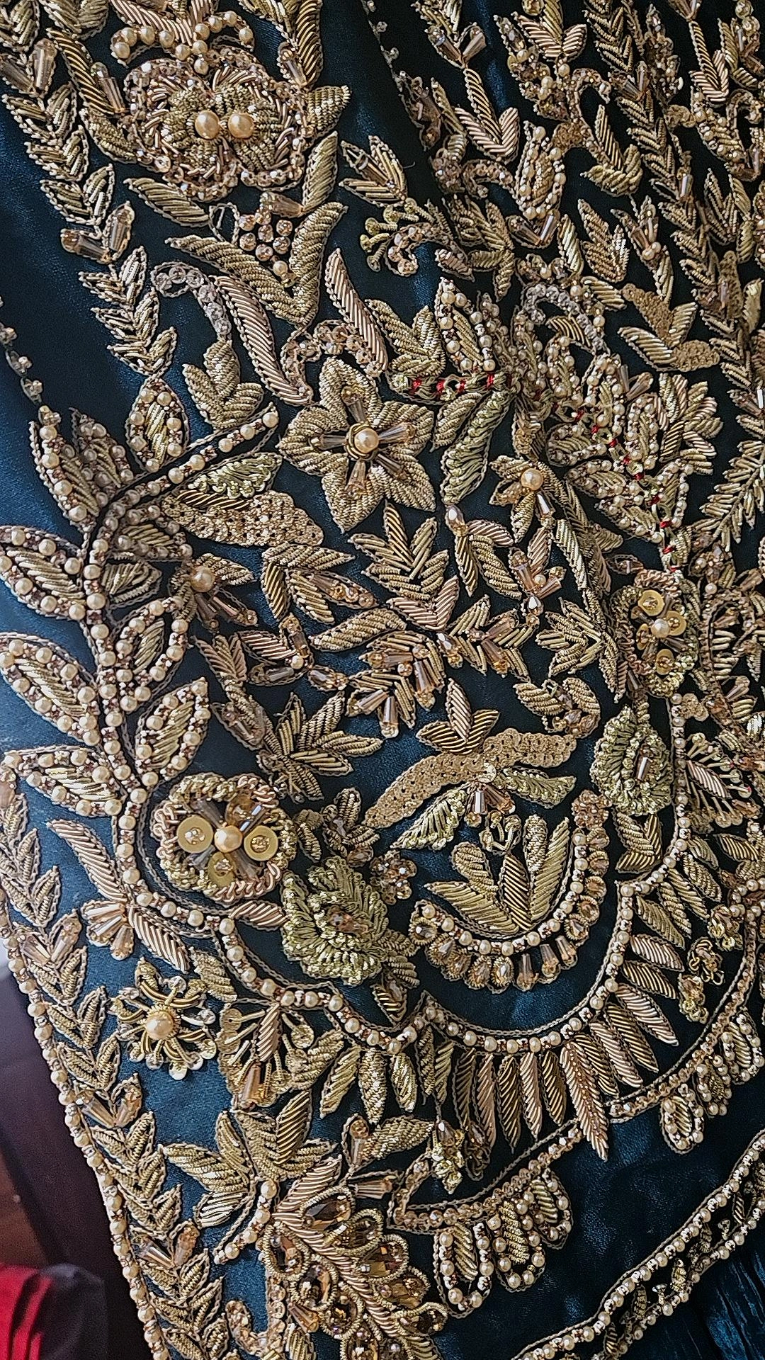 - Work: Hand-embellished with dabka, zardozi,naqshi & sequins.