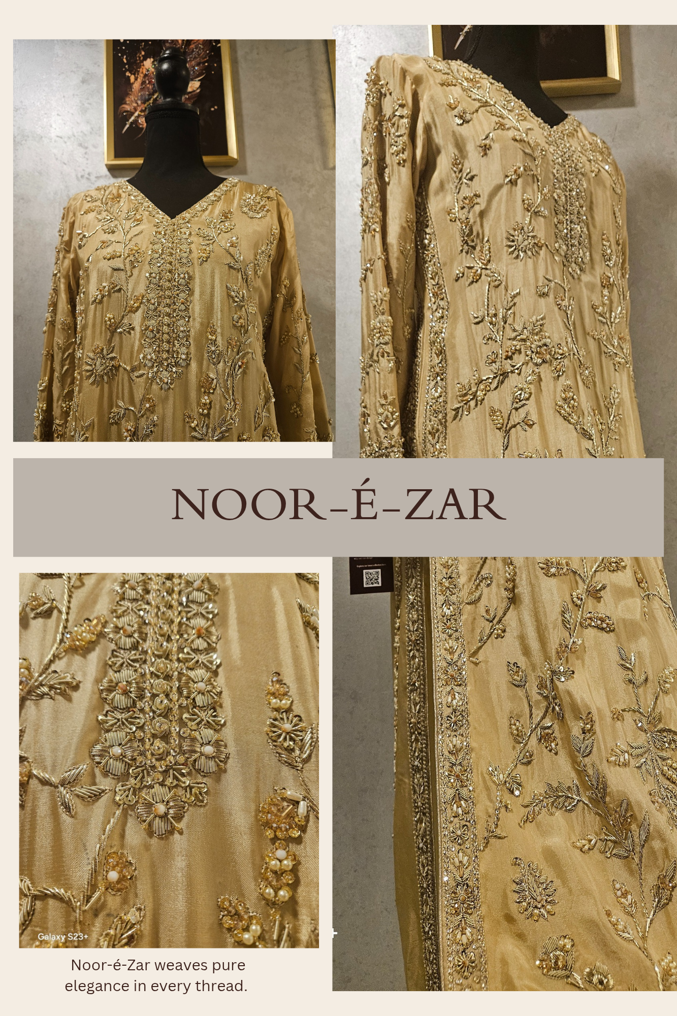Experience the finest craftsmanship with our luxury formal collection — where timeless elegance meets the latest designs. Each piece is meticulously handcrafted to perfection and made exclusively on pre-order, ensuring true exclusivity for every client. Candlelight cream meets timeless zardozi—Noor-é-Zar weaves pure elegance in every thread. Customize your look: short with crushed sharara or long with luxe culottes.