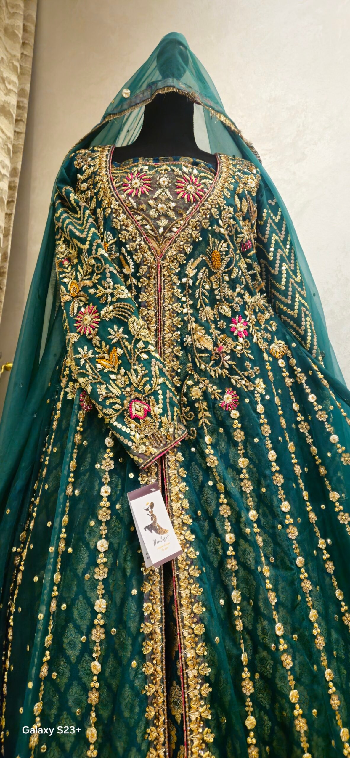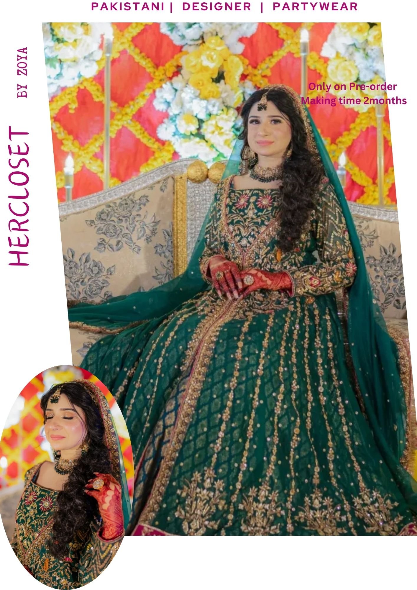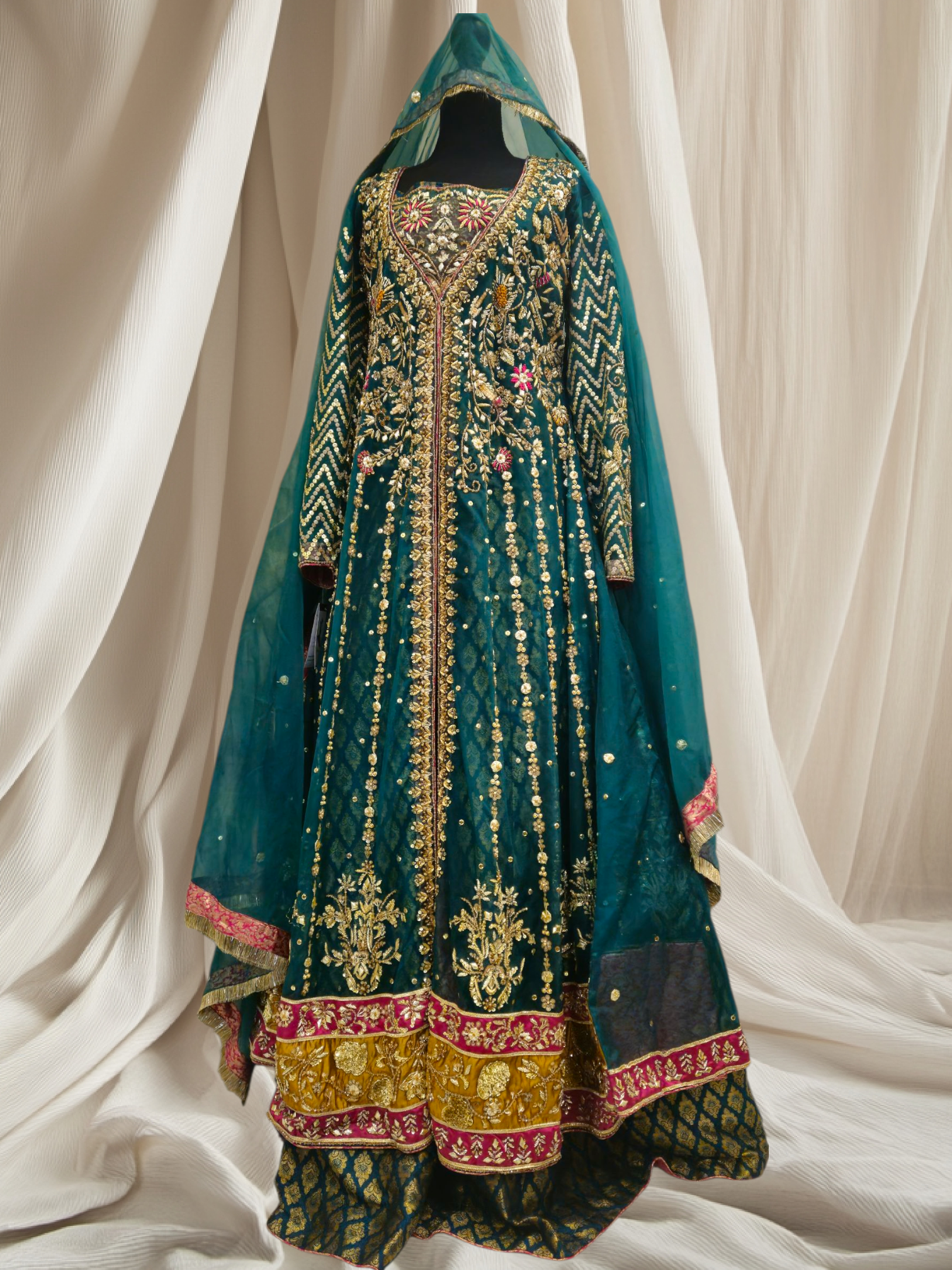 A flared kalidar drenched in royal emerald green, adorned with the most intricate kora dabka, gota, colorful resham, matte and glitter sequins. Every detail whispers elegance, every twirl feels like royalty. Ready to wear, tailored to your size — and yes, customizable in any color you desire.