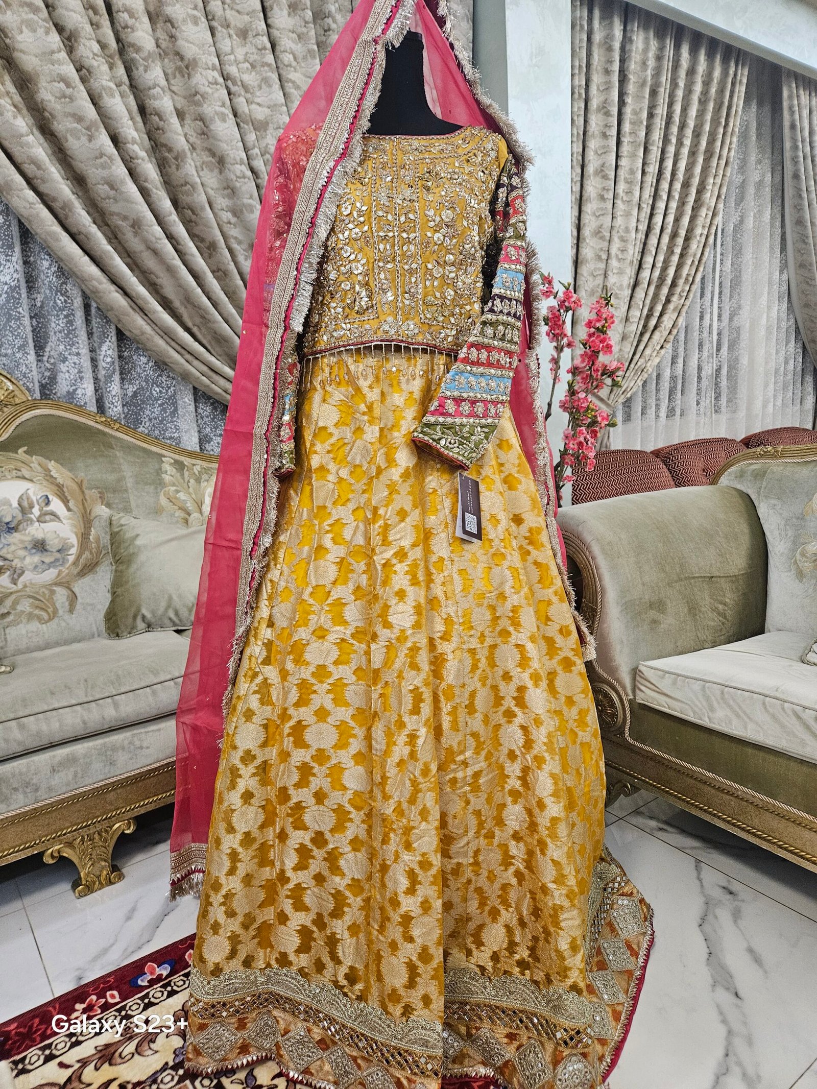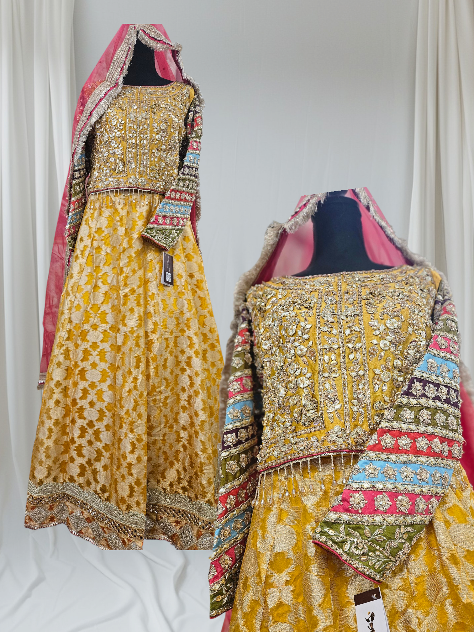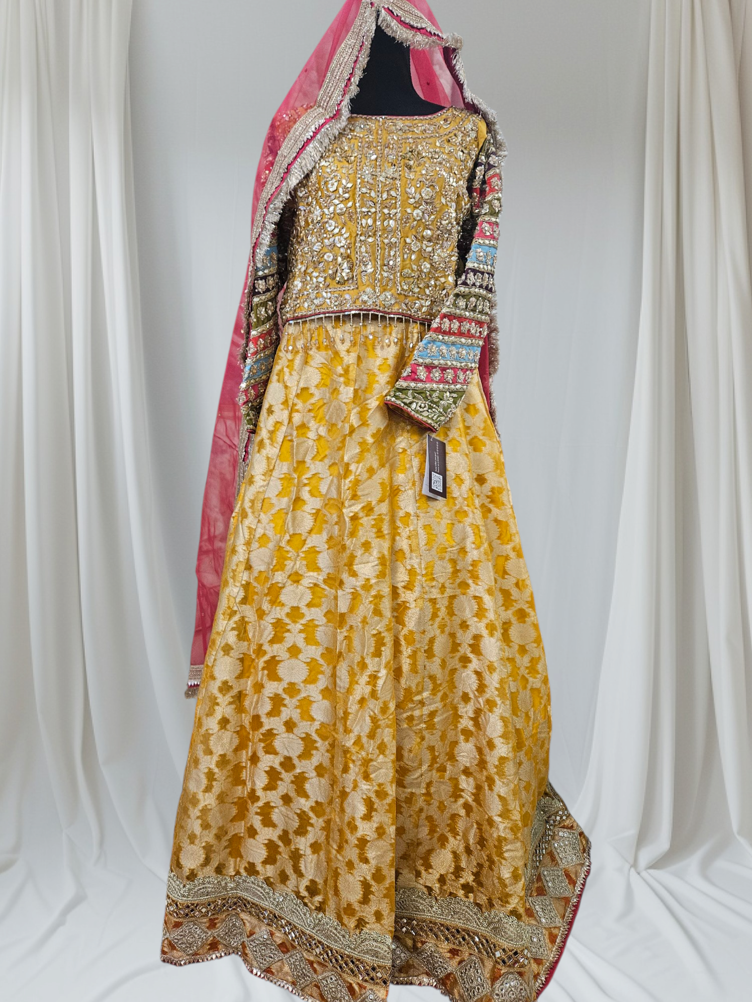 Paired with a classic banarsi lehenga, enhanced with delicate lace accents, and a net dupatta featuring mukesh work, lace edging, and traditional kiran finish, this ensemble captures the joyful spirit of Mayo/Mehndi with an aura of regal craftsmanship.