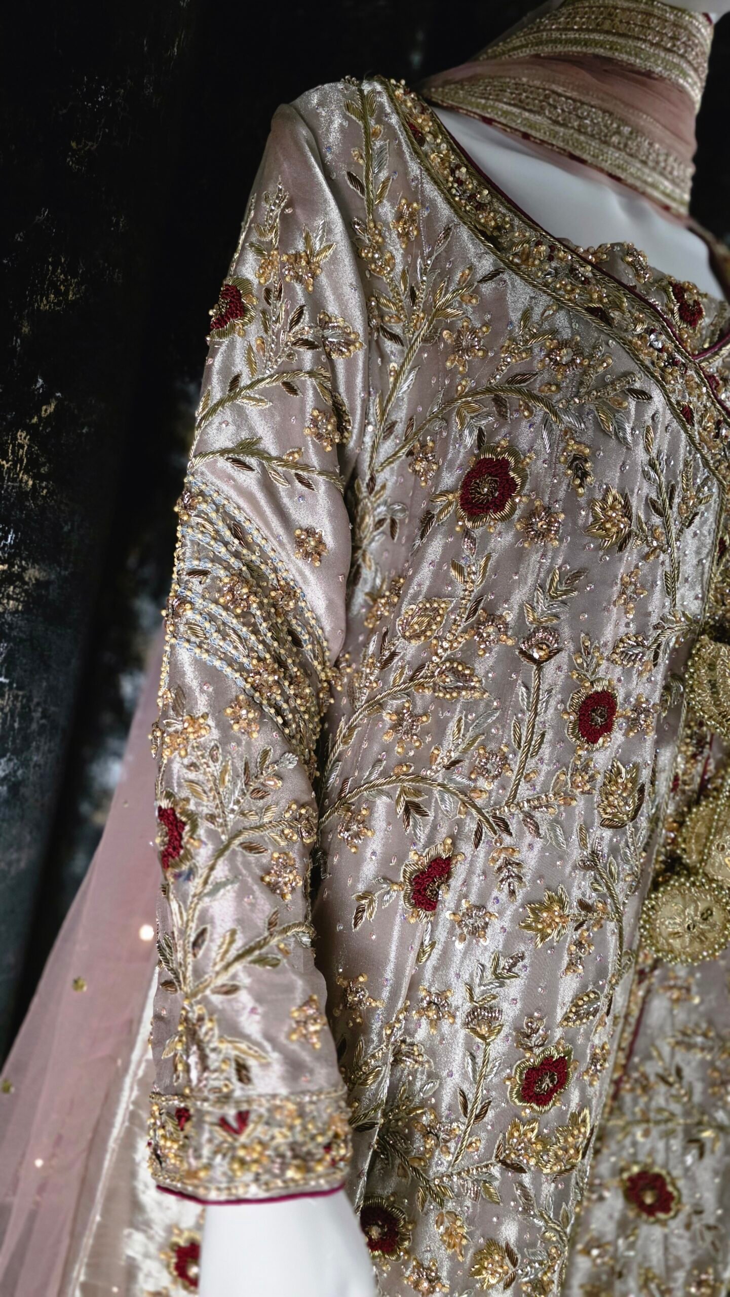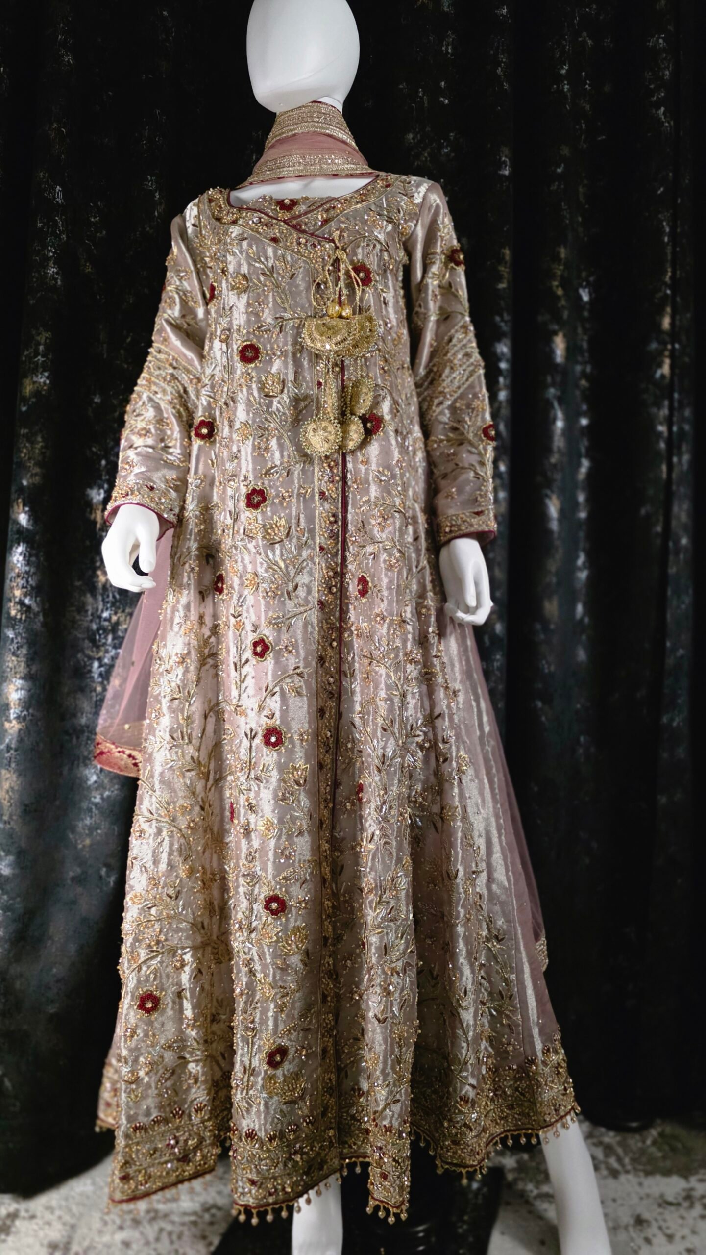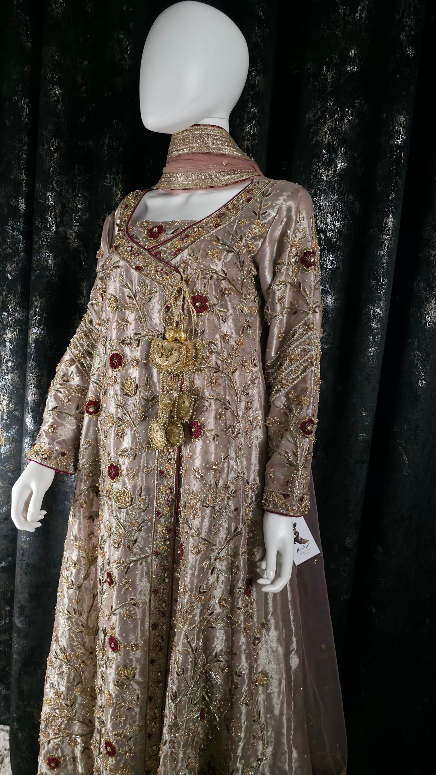 Presenting Mermaid Glow — our soft lilac A-line Tissue Angrakha, lavishly hand-embellished with dabka, the shirt is adorned with gold zardozi motifs and contrasting resham florals, crafted meticulously over shimmering lame tissue, crystals. It is paired with a contrasting maroon khadi net dupatta. perfect for your festive soirées, bridesmaid charm, or trousseau glow.
