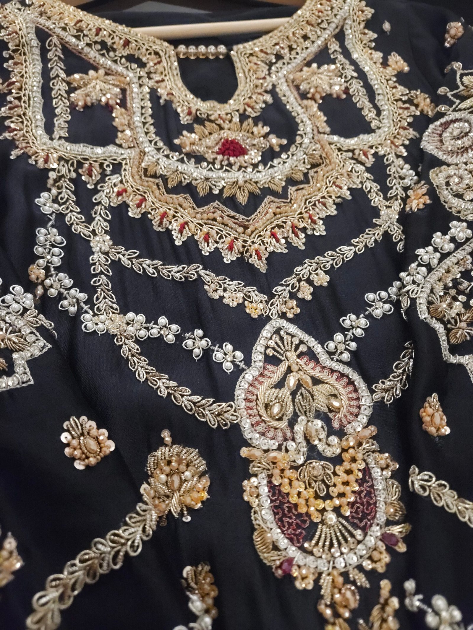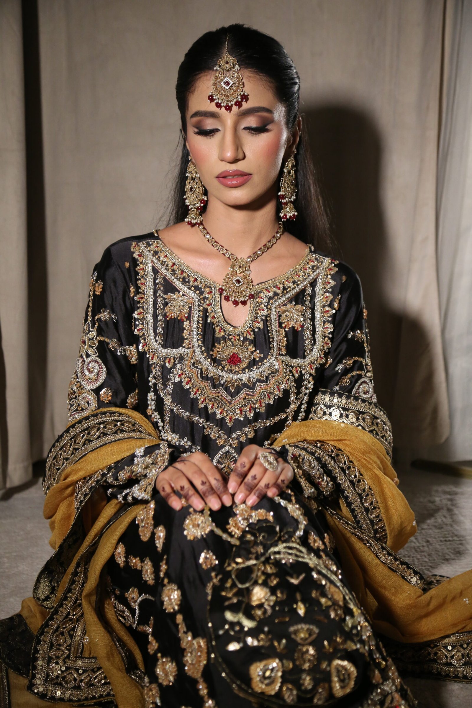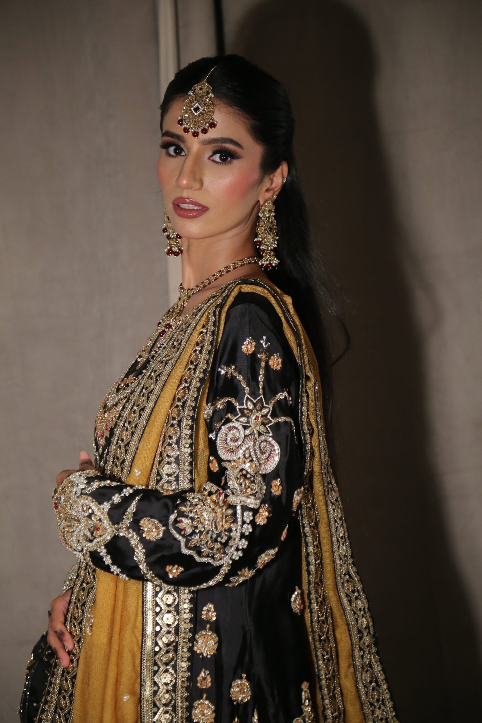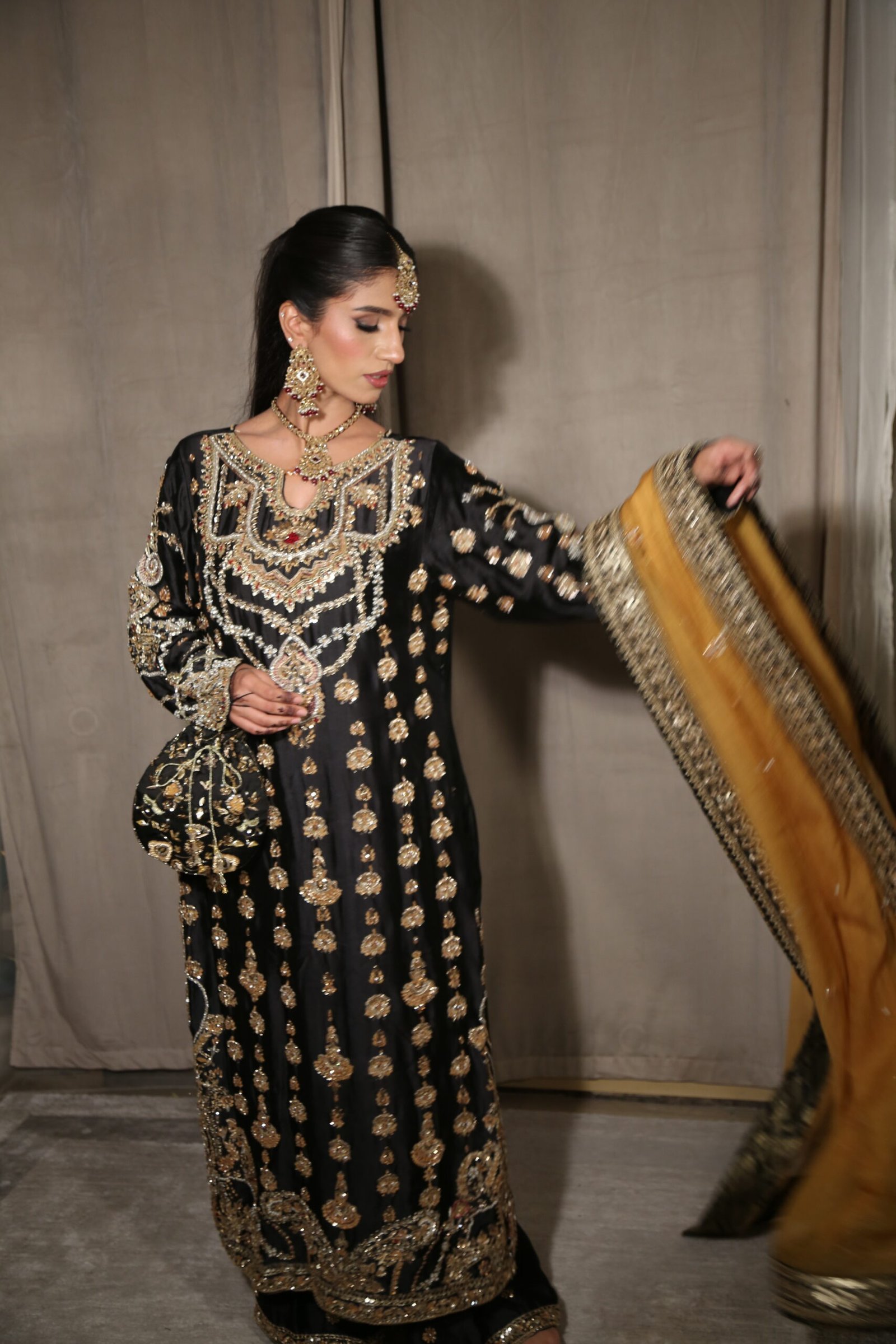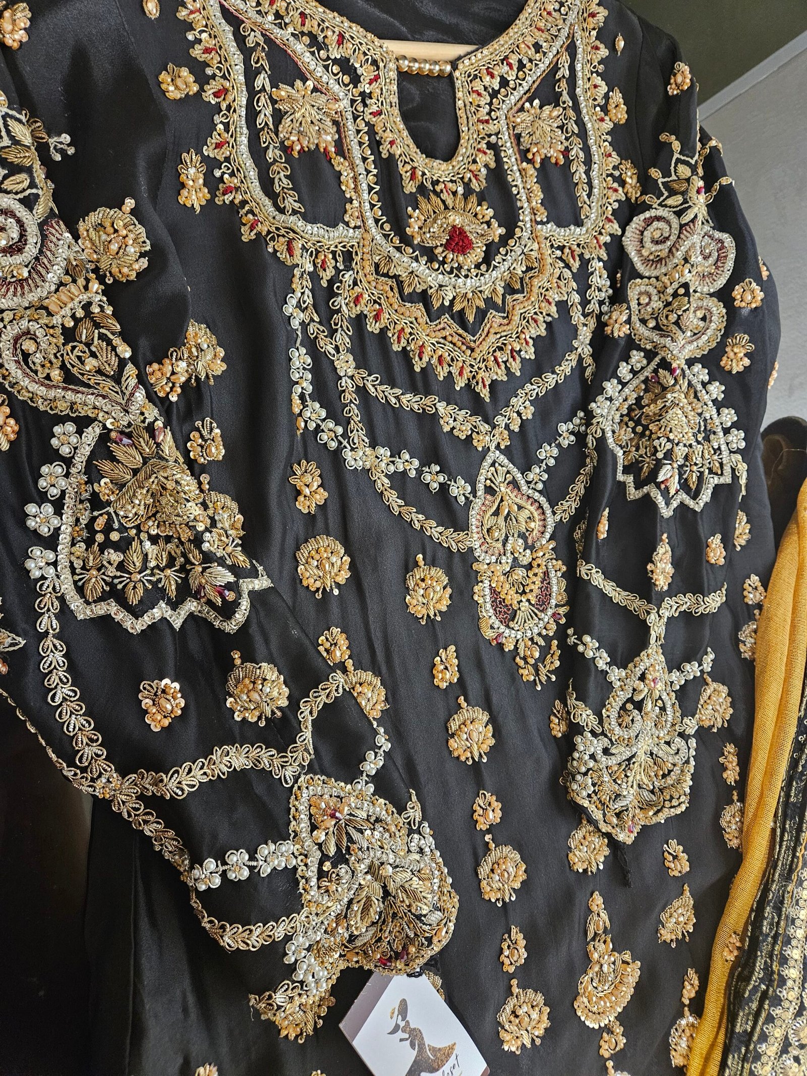 A timeless luxury formal, this beauty exudes regal allure with its intricate handwork—delicately balanced dabka, crystal beads, resham, and Swarovski detailing that shimmer with every glance. Paired with a contrasting mustard dupatta for that perfect pop of color, this ensemble strikes the ideal harmony between tradition and modern elegance. Perfect for bridesmaids or evening soirées, crafted with meticulous precision and grace.