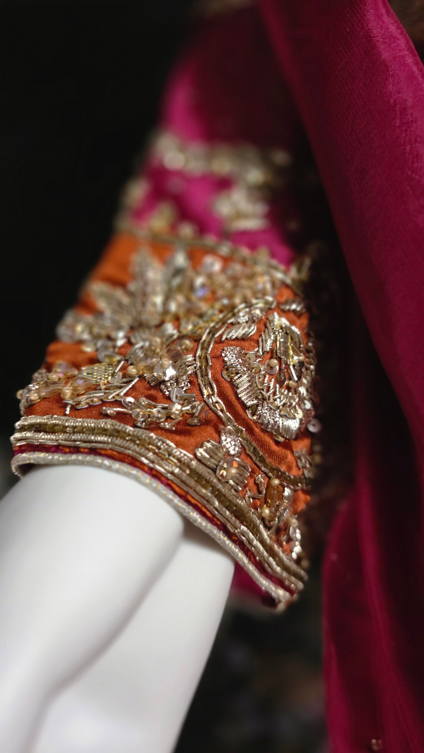 Rangrez Rani is a striking silhouette rendered in a vibrant magenta pink hue, featuring a statement pure sheesha silk shirt framed with contrast rust appliqué borders. The shirt is richly embellished with handcrafted zardozi and crystal work, creating a luminous interplay of texture and shine.