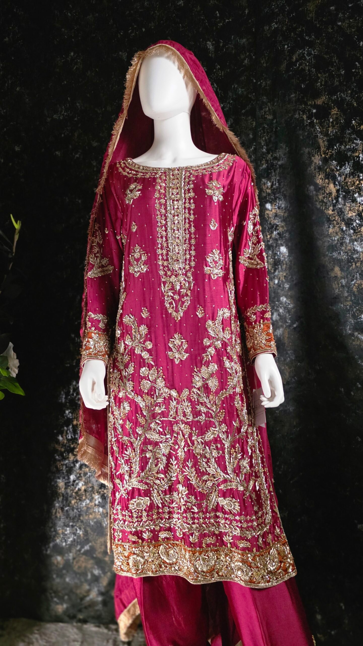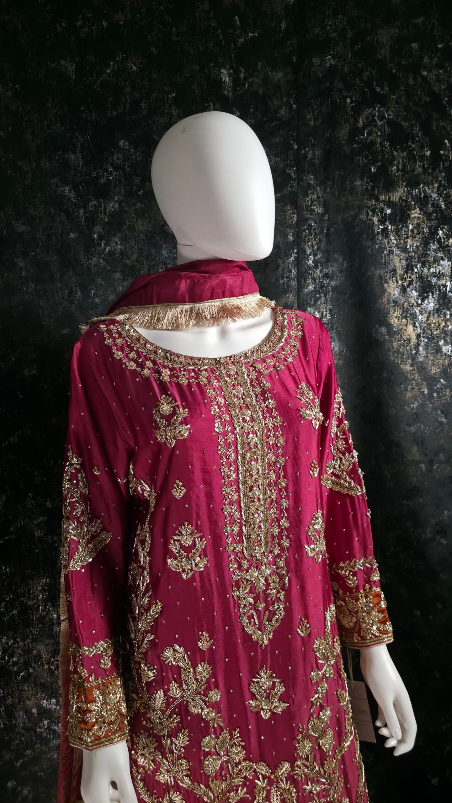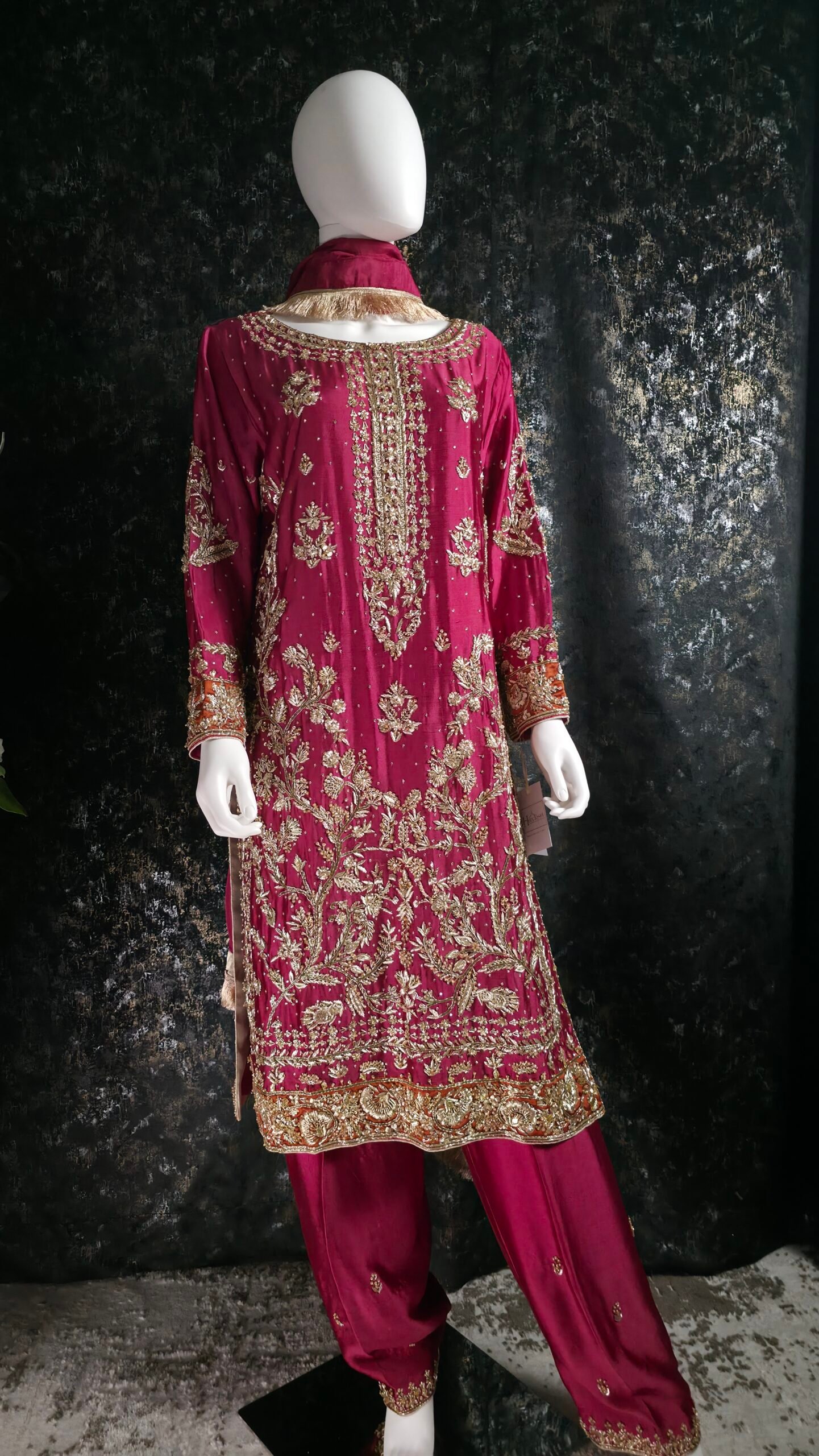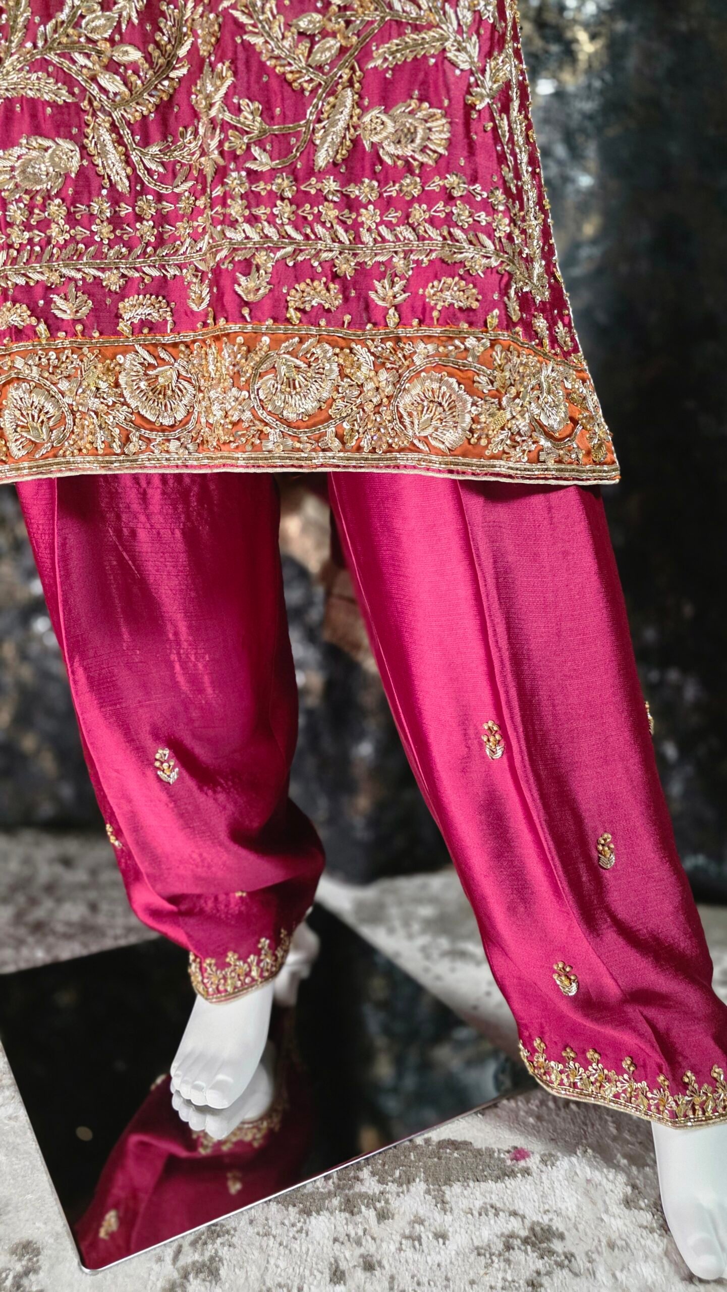 Paired with coordinated pants detailed with complementing borders, the ensemble is elevated with a graceful medium silk dupatta that completes the look with understated elegance. Designed for those who appreciate bold color stories and refined craftsmanship, this outfit is perfect for festive soirées.