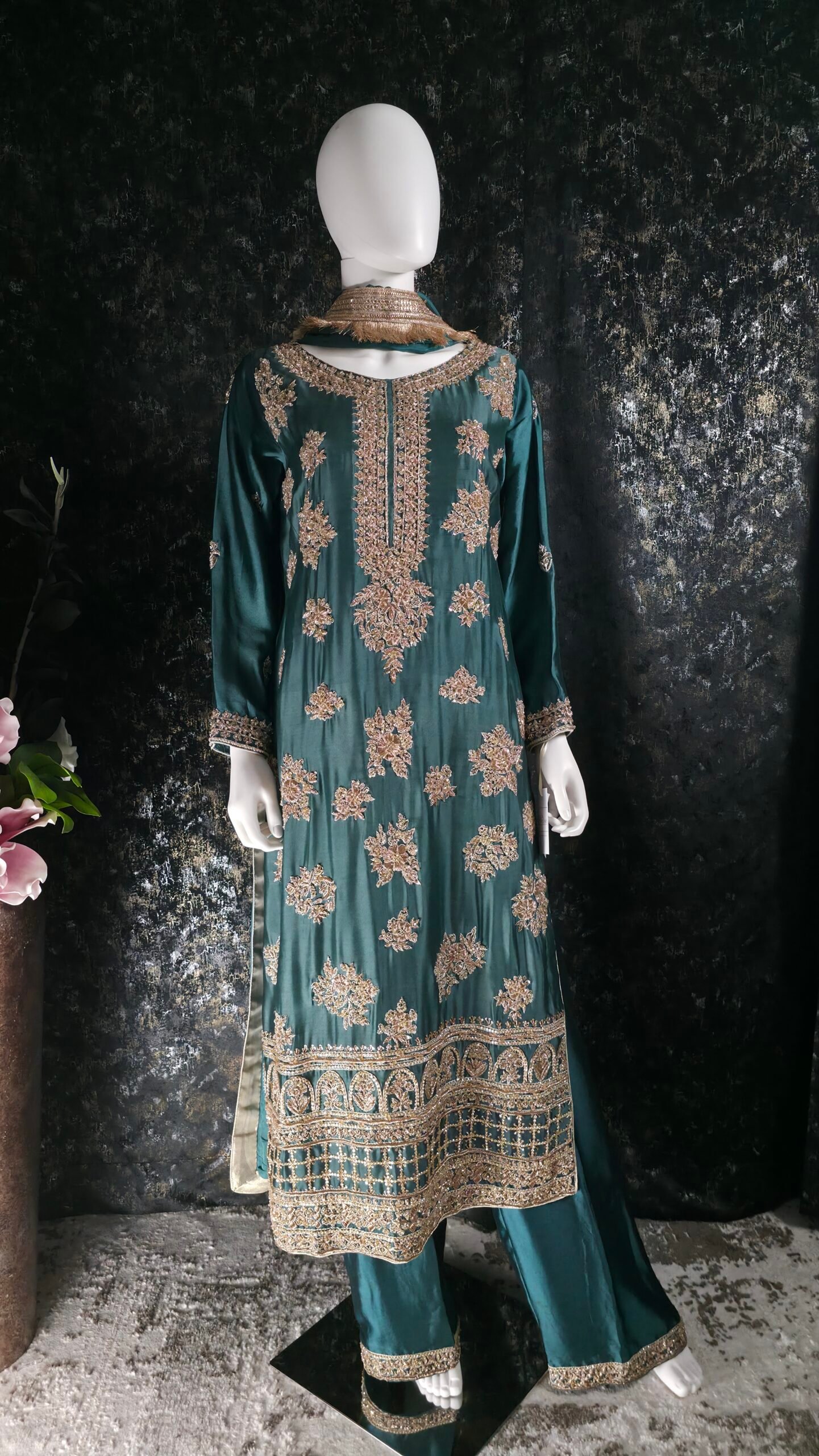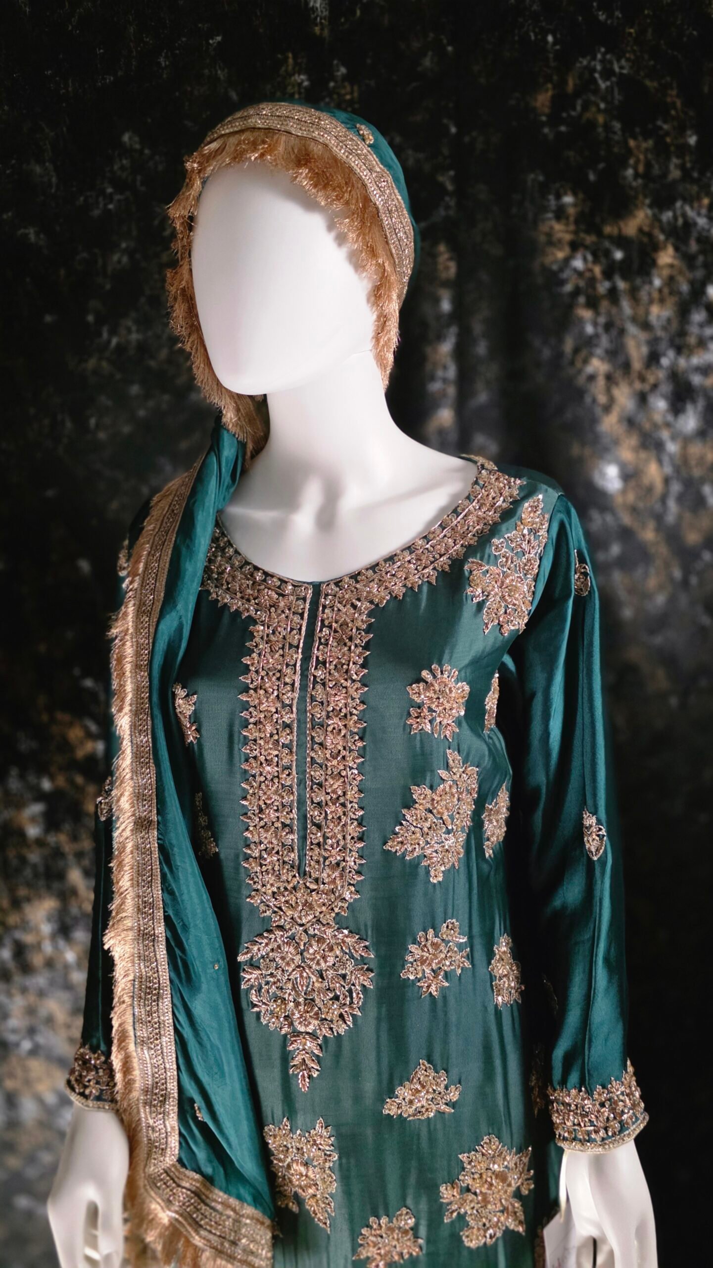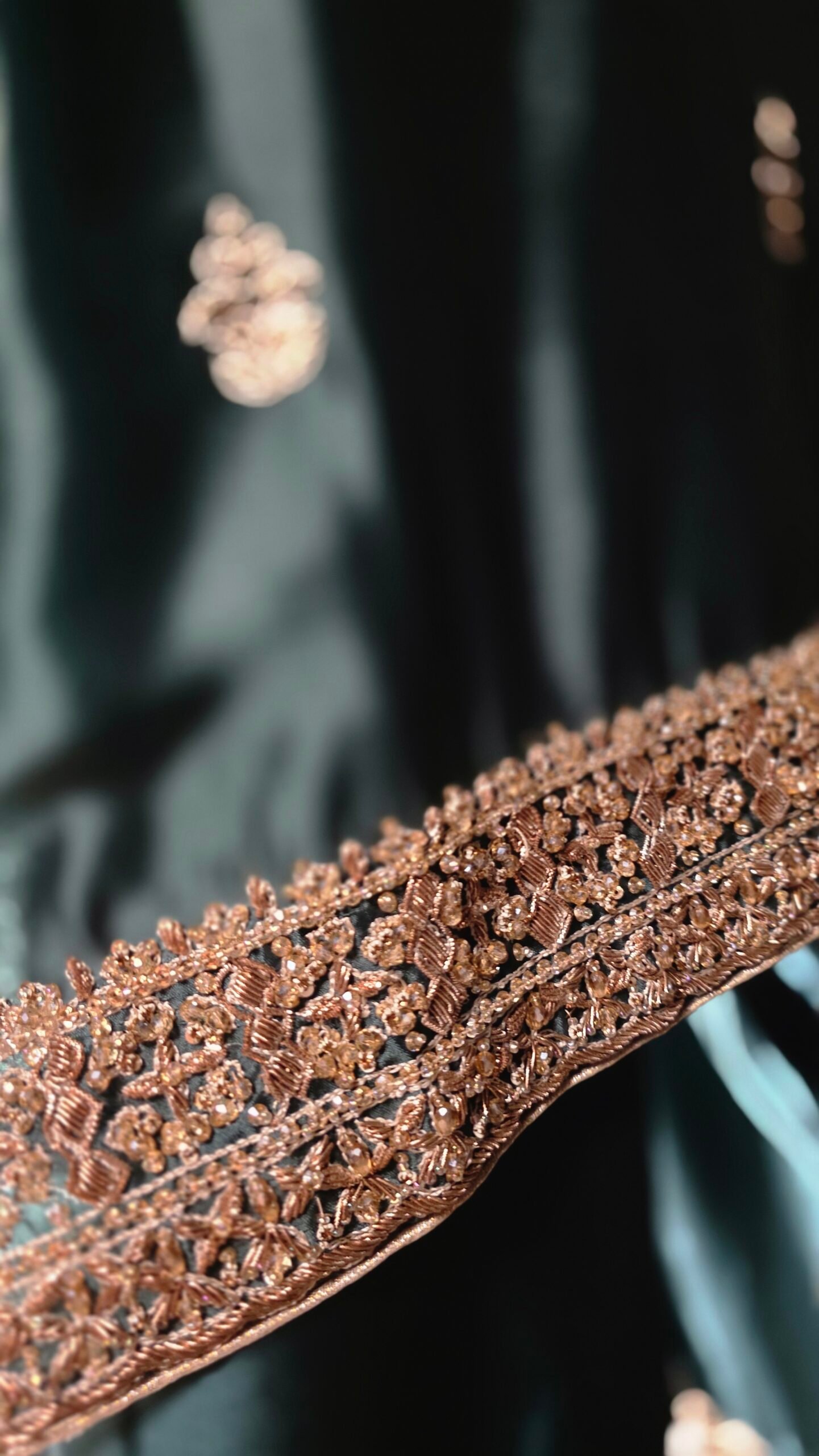 A striking pure tissue silk ensemble available in two rich hues — burnt rust orange and deep teal green — crafted for statement festive elegance.