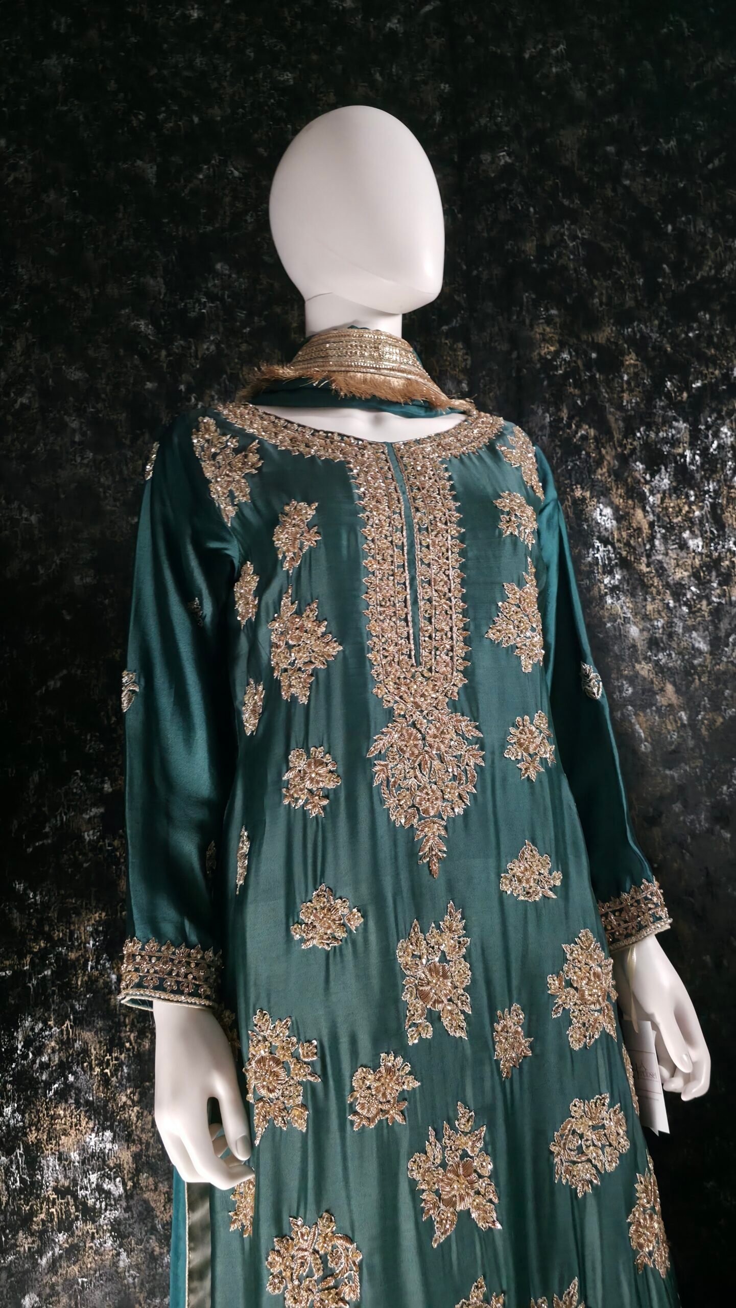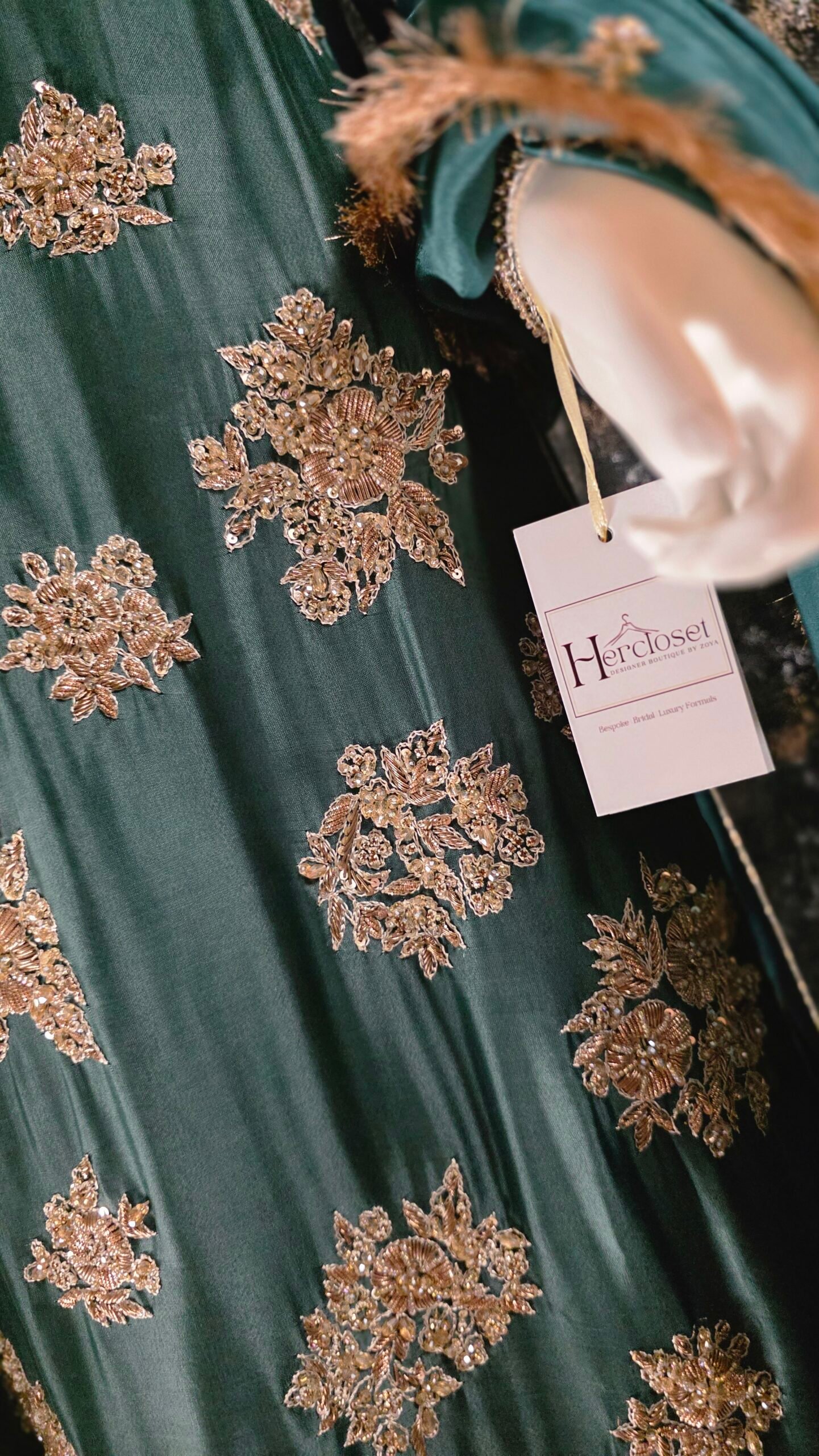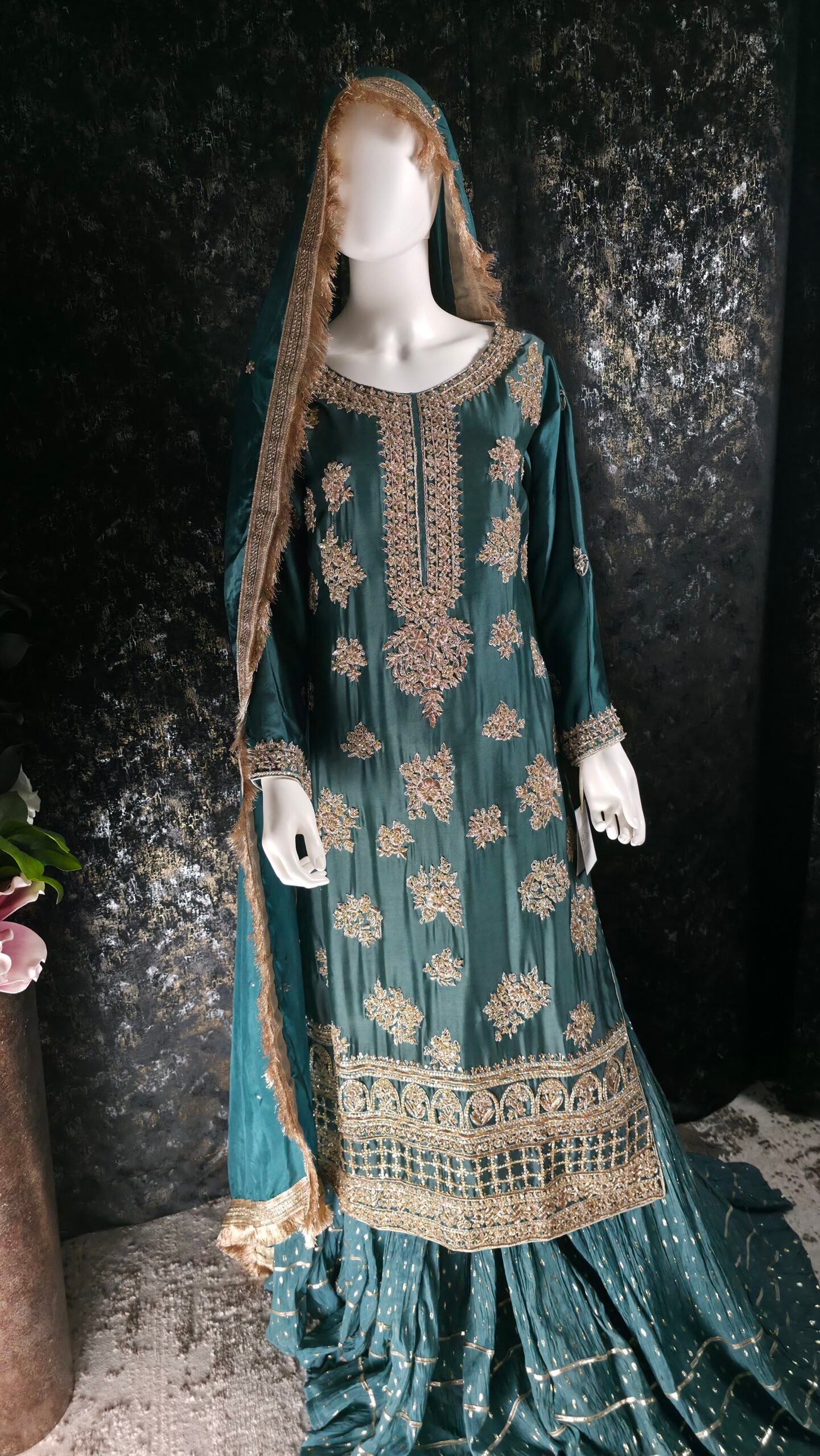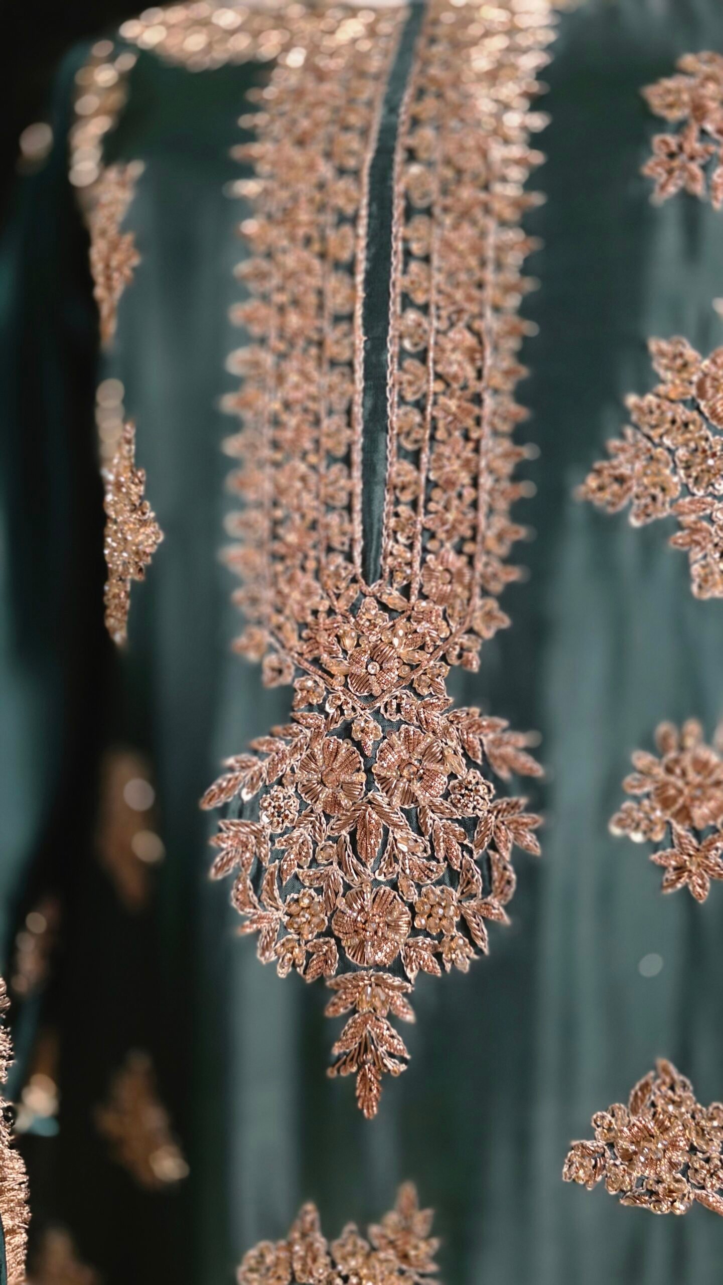 A vibrant luxury ensemble designed for mehndi nights, wedding festivities, and grand celebrations.