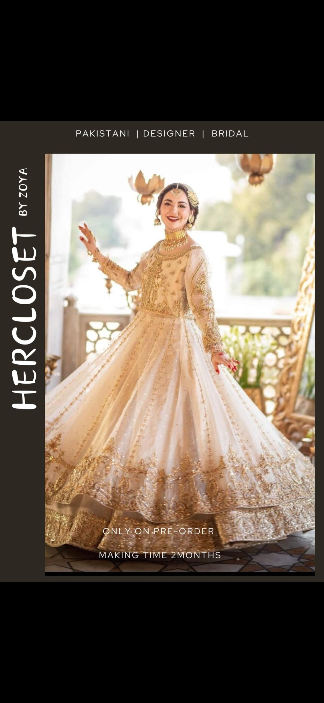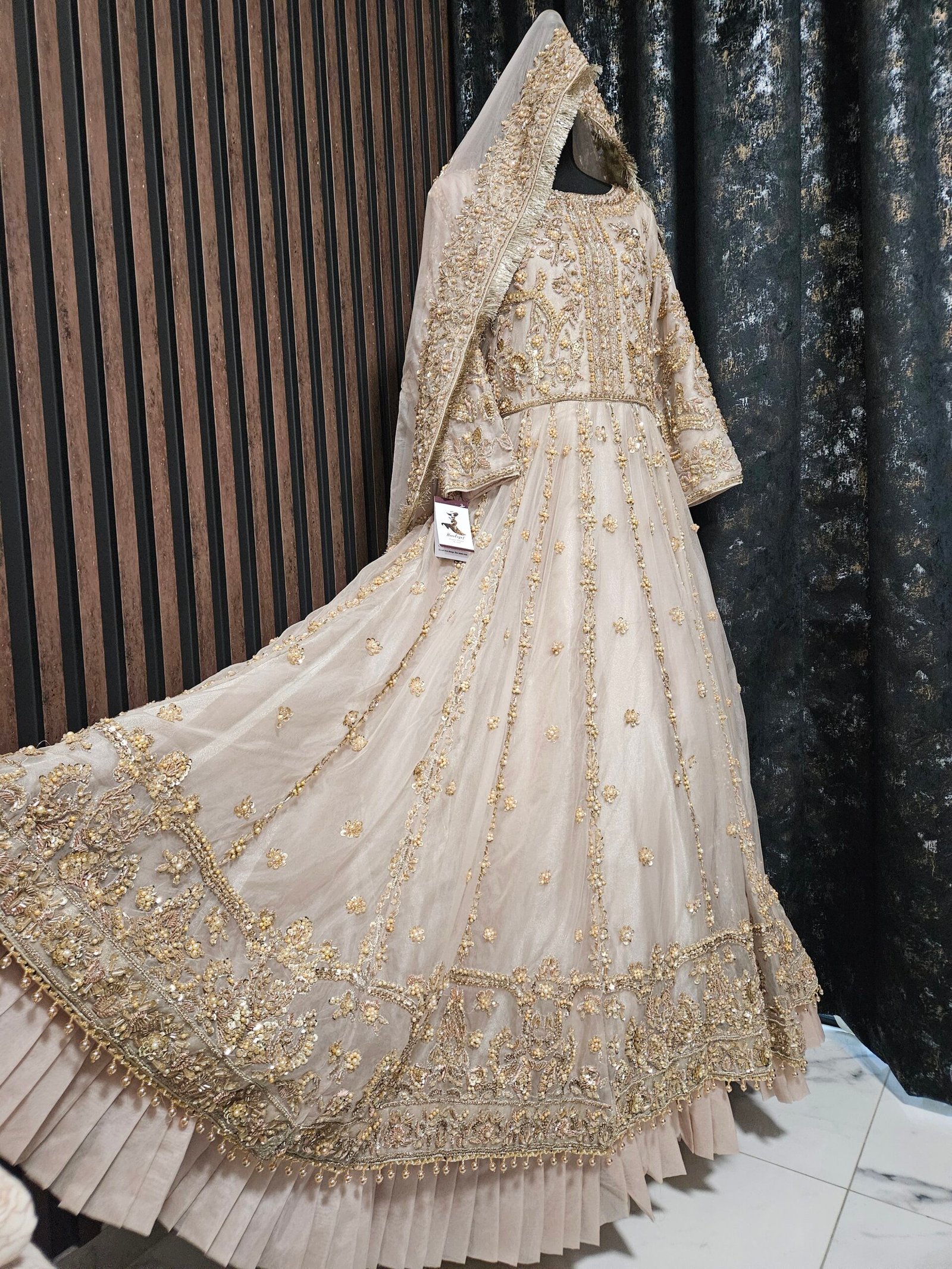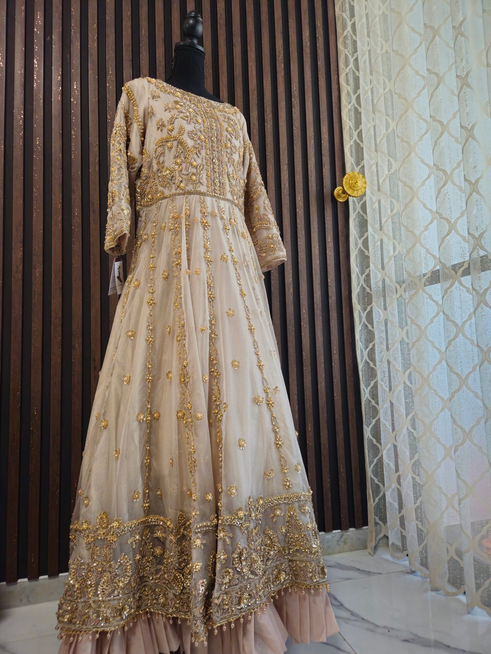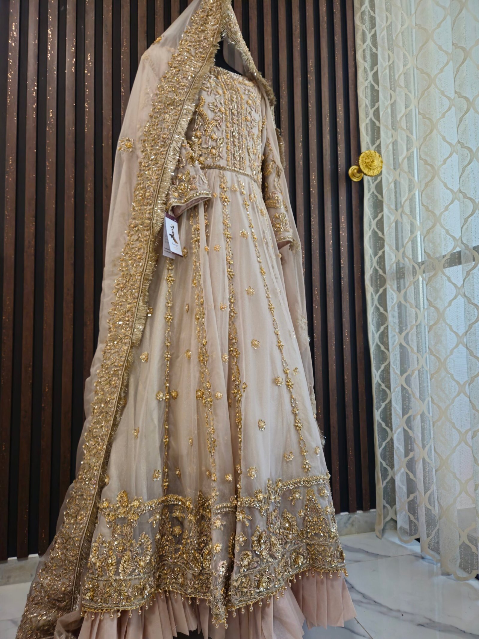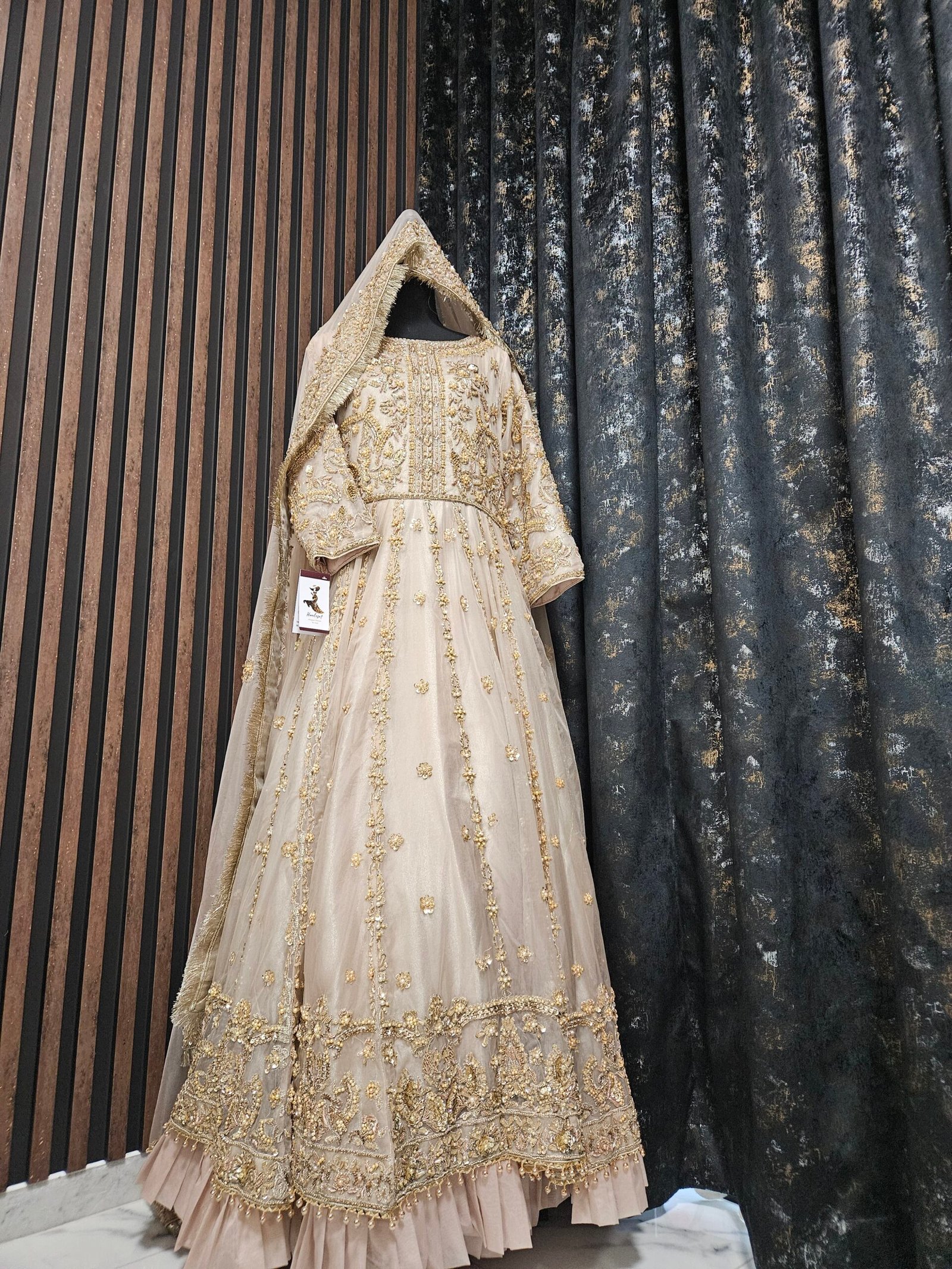 Royale Blush is jaw-dropping rose gold peshwas beckons you into a realm of sheer elegance. This beauty is lavishly embellished with dabka, delicate seed pearls and glistening crystals on soft Organza layered with Tissue underneath for that timeless shimmer, finished off with a frill for your perfect twirl moment. It is paired gracefully with a four-sided heavy embellished dupatta, finished off with beautiful tamba kiran lace.