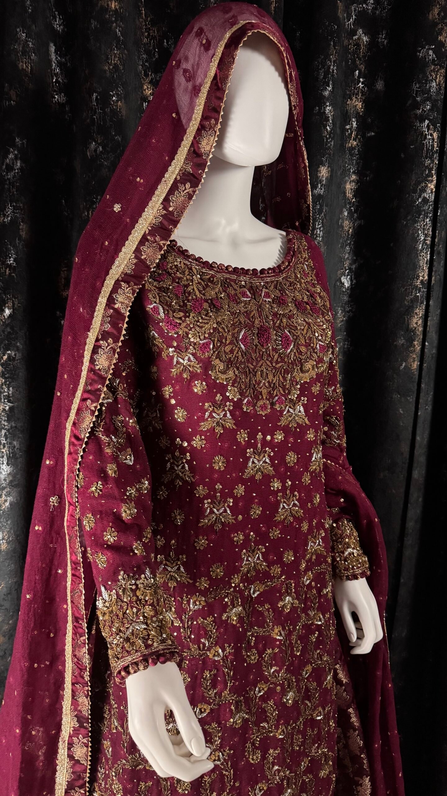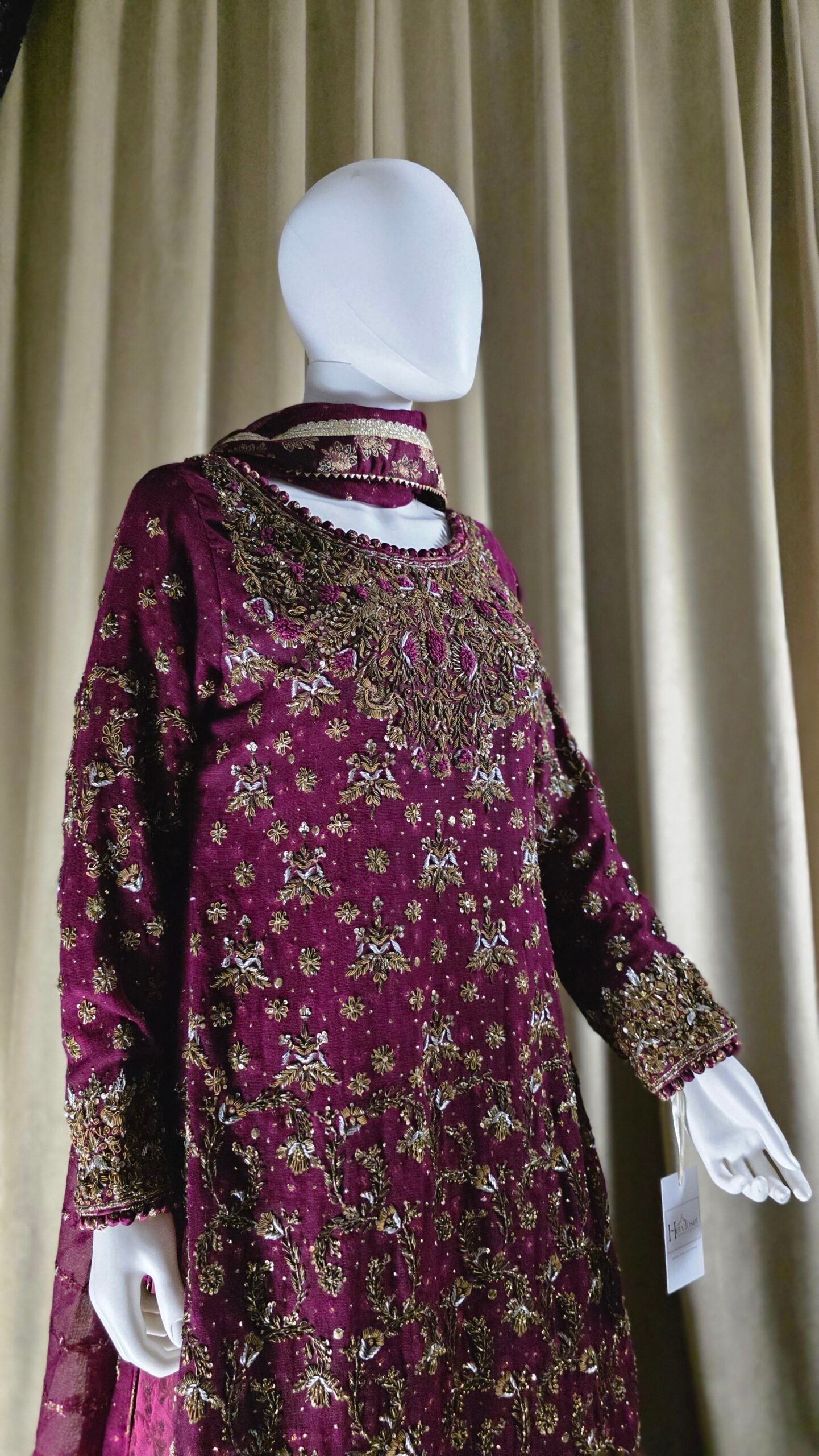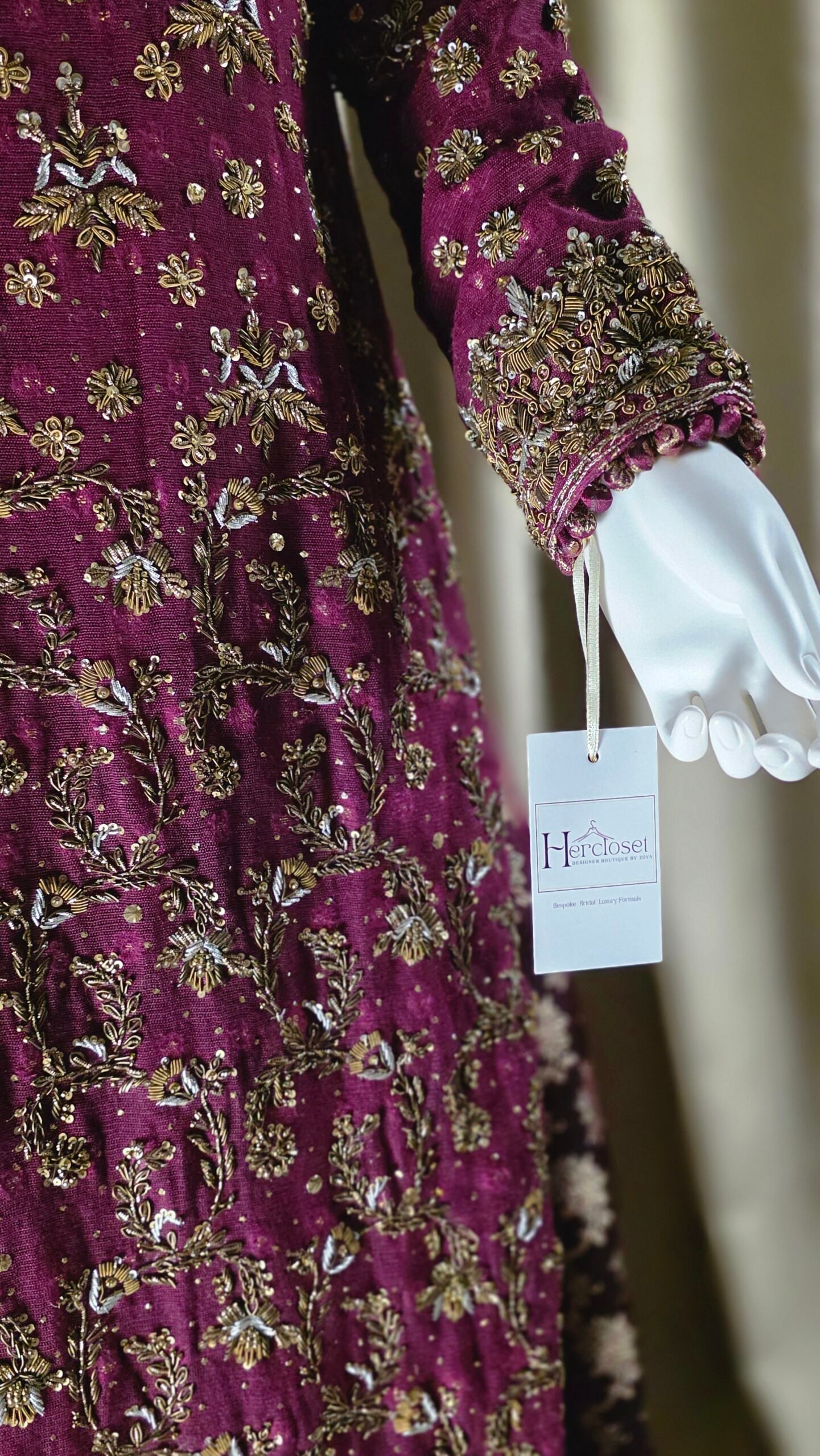 Paired with a luxurious wine Banarsi farshi that flows with grandeur, completing this timeless couture silhouette.