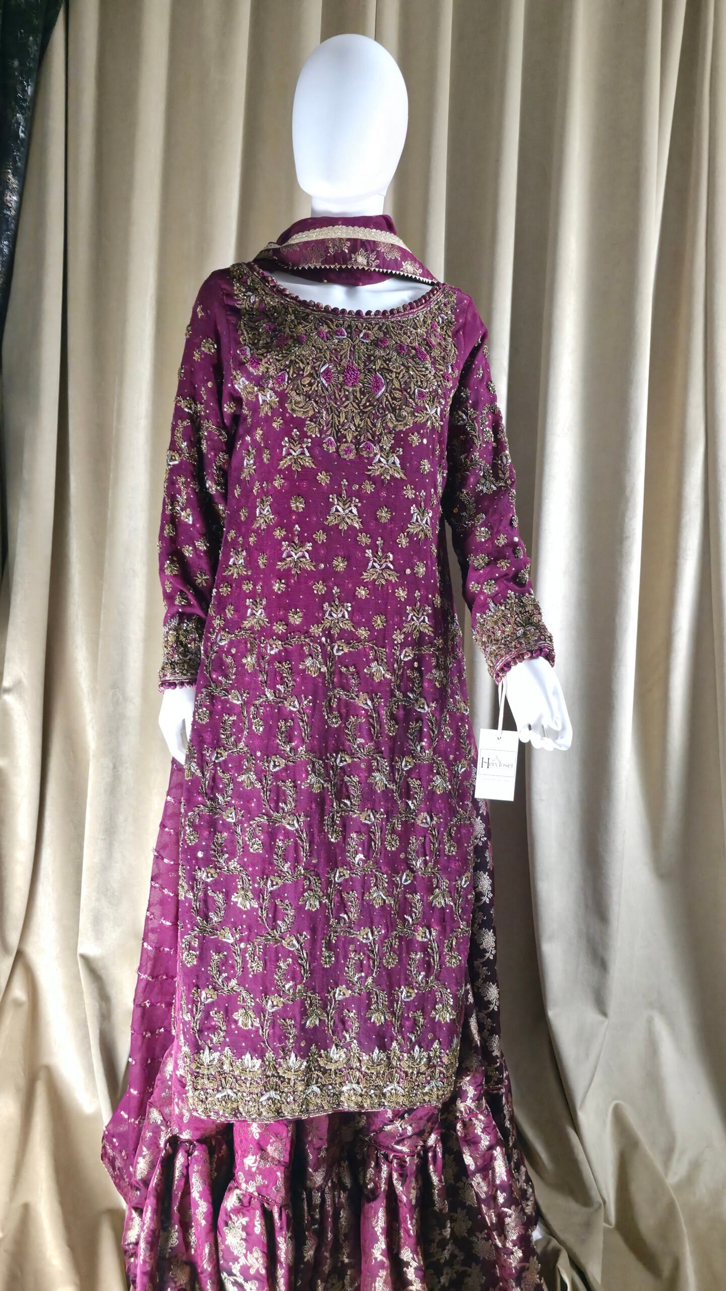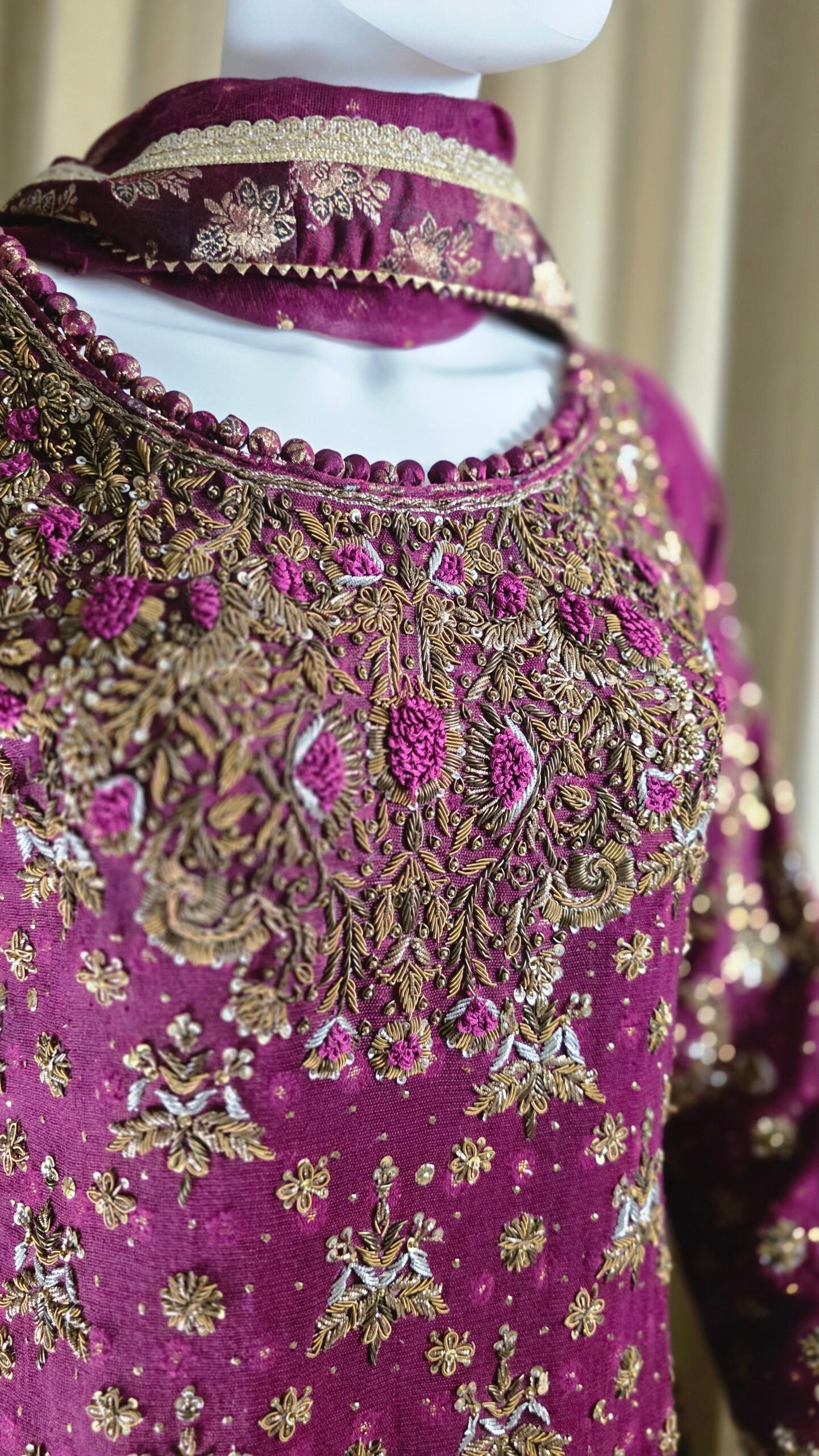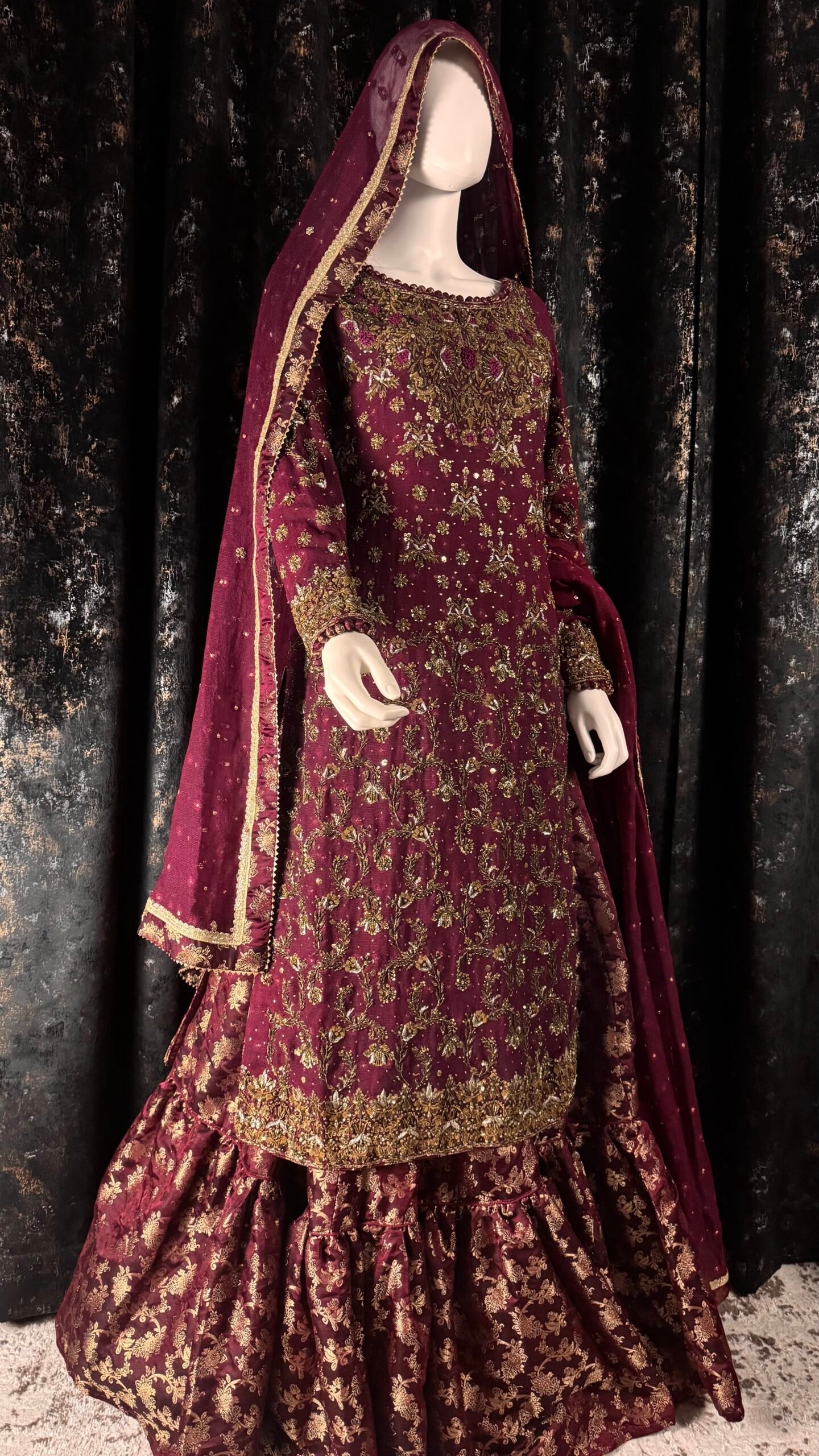 Paired with a luxurious wine Banarsi farshi that flows with grandeur, completing this timeless couture silhouette.
