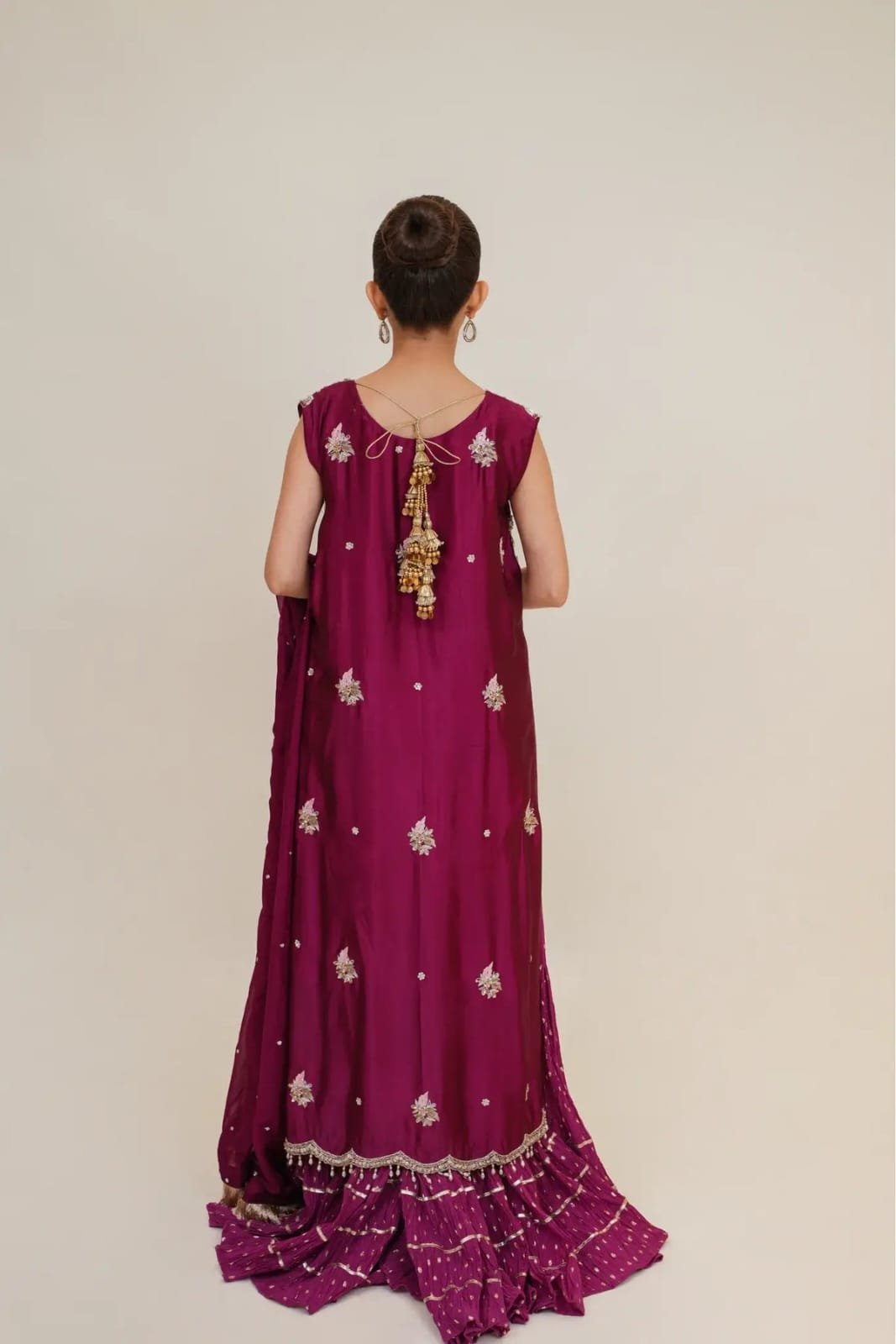 “Sohni,” brings a radiating deep magenta silhouette. The shirt, adorned with intricate details of white gold, beads, gold nashi, copper dabka, and gold sequins on the neckline, chaak & daman stands as a testament to timeless elegance. The front and back carry matching craftsmanship, drawing attention to the chaak for a cohesive, refined look and is Paired with a banarsi crush sharara pants.Sohni Dresses
