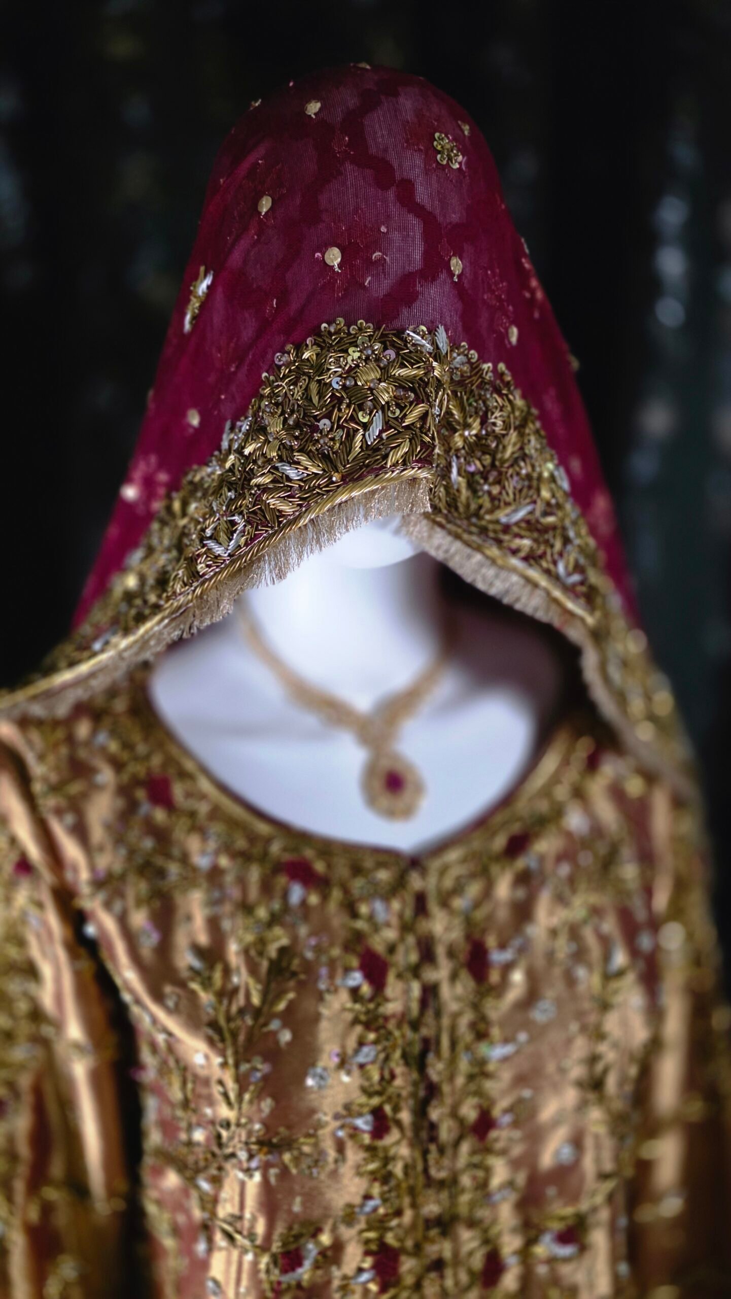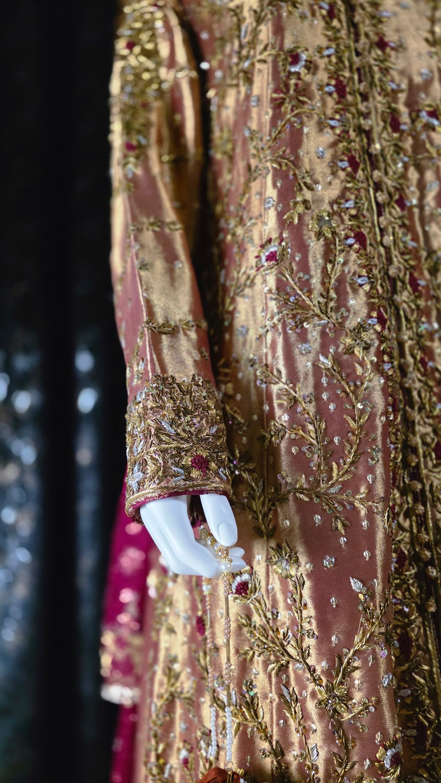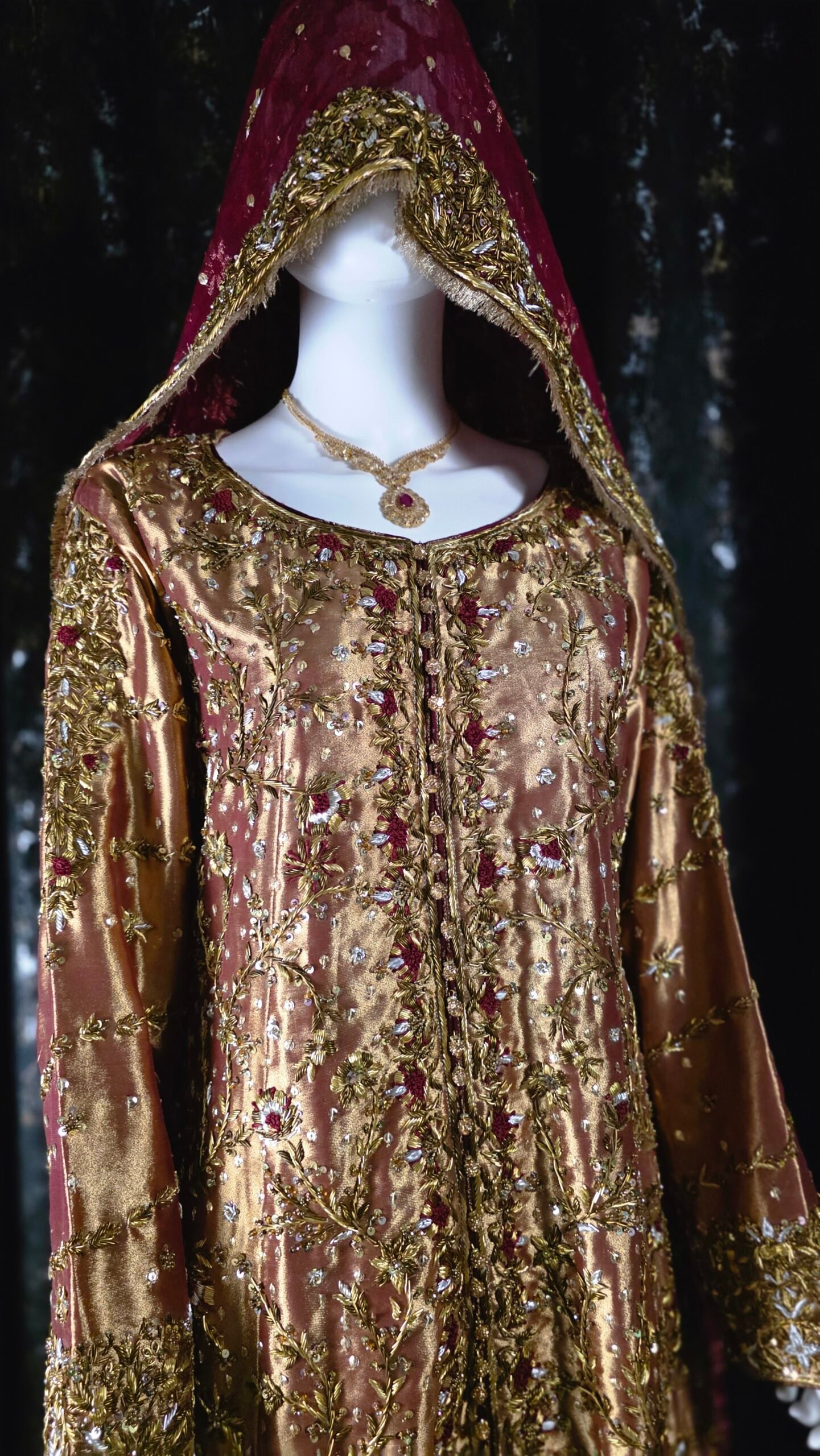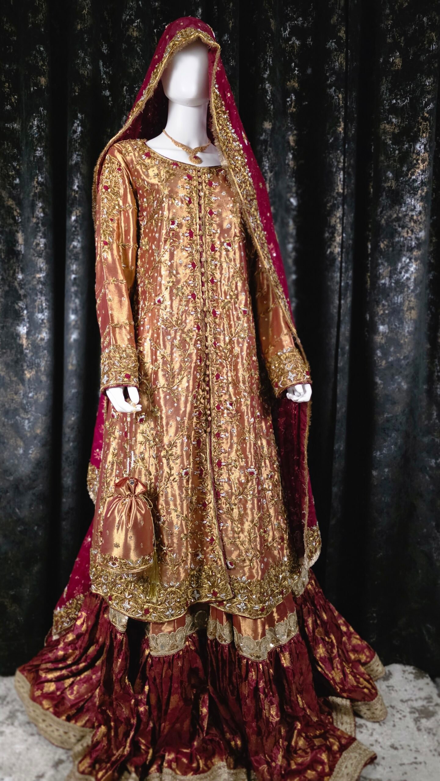 Zariya is a timeless ensemble crafted in a rich copper rust hue, designed for those who appreciate refined luxury and heritage craftsmanship. The outfit features a long A-line shirt tailored in luminous pure lamé tissue, offering a graceful flow and radiant finish. The silhouette is beautifully elevated with intricate two-tone dabka handwork, delicately accented with contrast resham detailing that adds depth, dimension, and regal charm to every stitch.