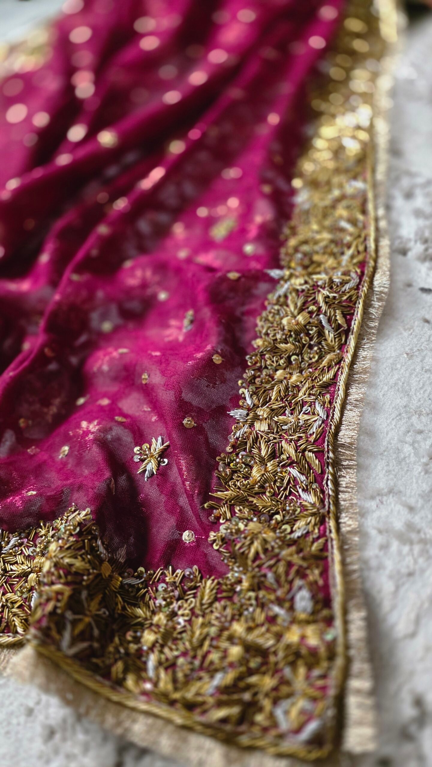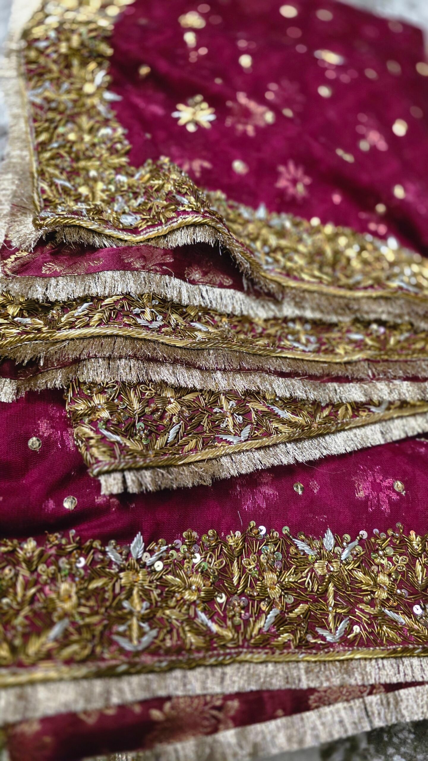 Paired with a statement Jamawar Farshi Lehenga, Zariya exudes traditional grandeur while maintaining a modern heirloom appeal. The look is completed with a striking Banarasi khadi net dupatta in deep maroon, finished with four-sided ornate borders that create a graceful and elegant drape. Thoughtfully complemented with a matching handcrafted potli bag, this ensemble is a perfect choice for bridesmaids, festive celebrations, or intimate bridal occasions. An ode to timeless artistry and contemporary sophistication.